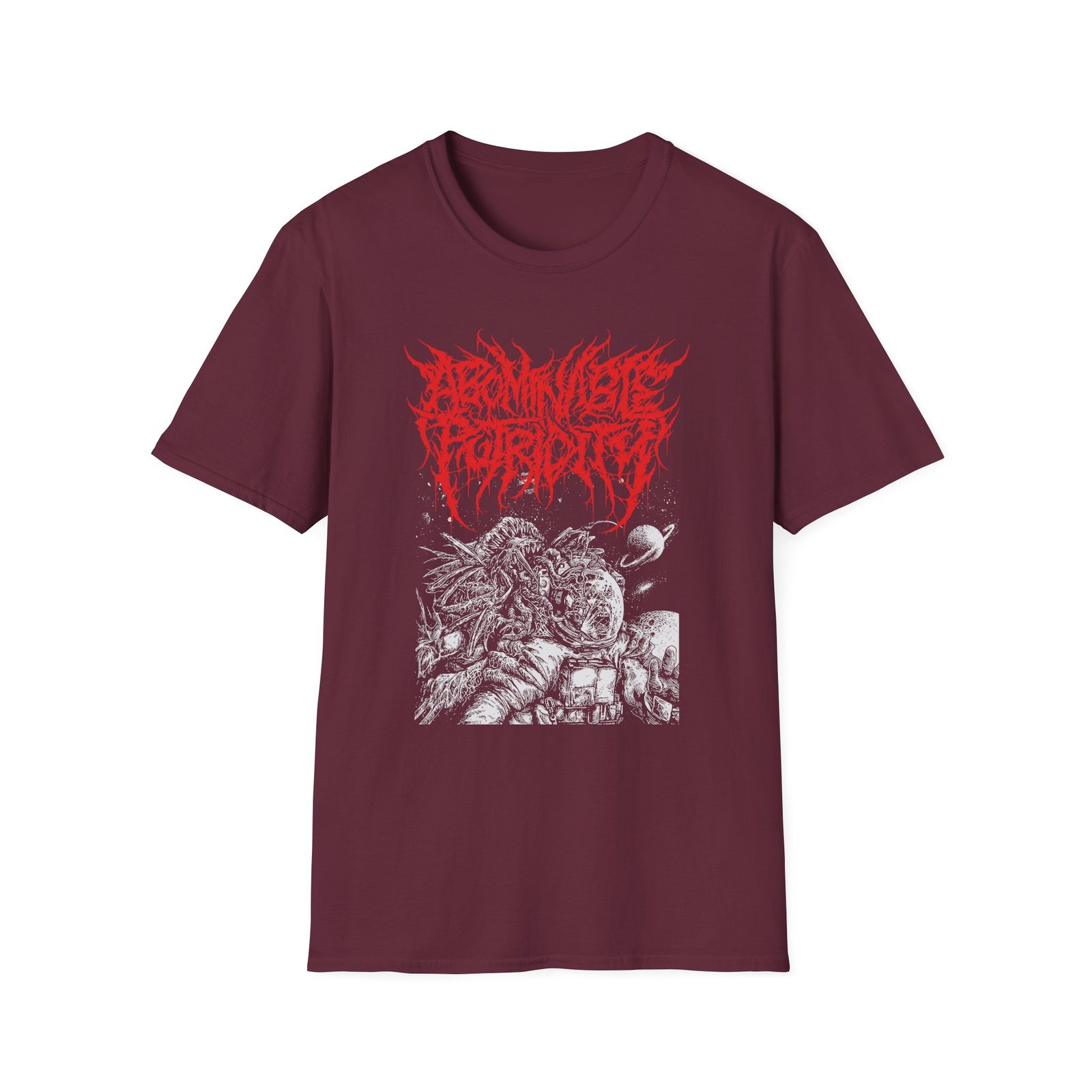 The Abominable Putridity The Last Astronaut Red Logo unisex soft-style t-shirt puts a new spin on casual comfort. Made from very soft materials, this tee is 100% cotton for solid colors. Heather colors and sports grey include polyester. The shoulders have twill tape for improved durability. There are no side seams. The collar is made with ribbed knitting to prevent curling damage.