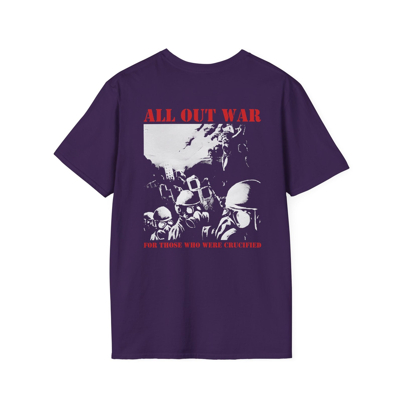 The All Out War Crucified Original unisex soft-style t-shirt puts a new spin on casual comfort. Made from very soft materials, this tee is 100% cotton for solid colors. Heather colors and sports grey include polyester. The shoulders have twill tape for improved durability. There are no side seams. The collar is made with ribbed knitting to prevent curling damage.