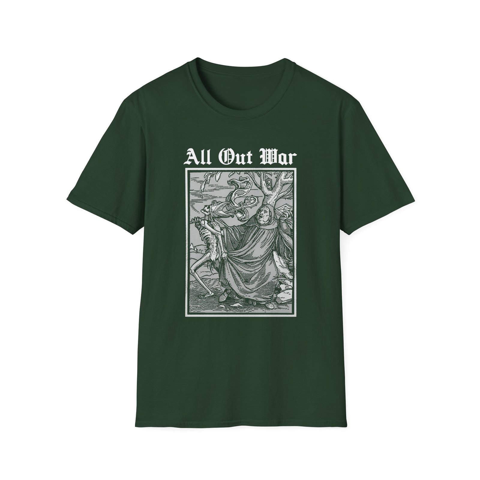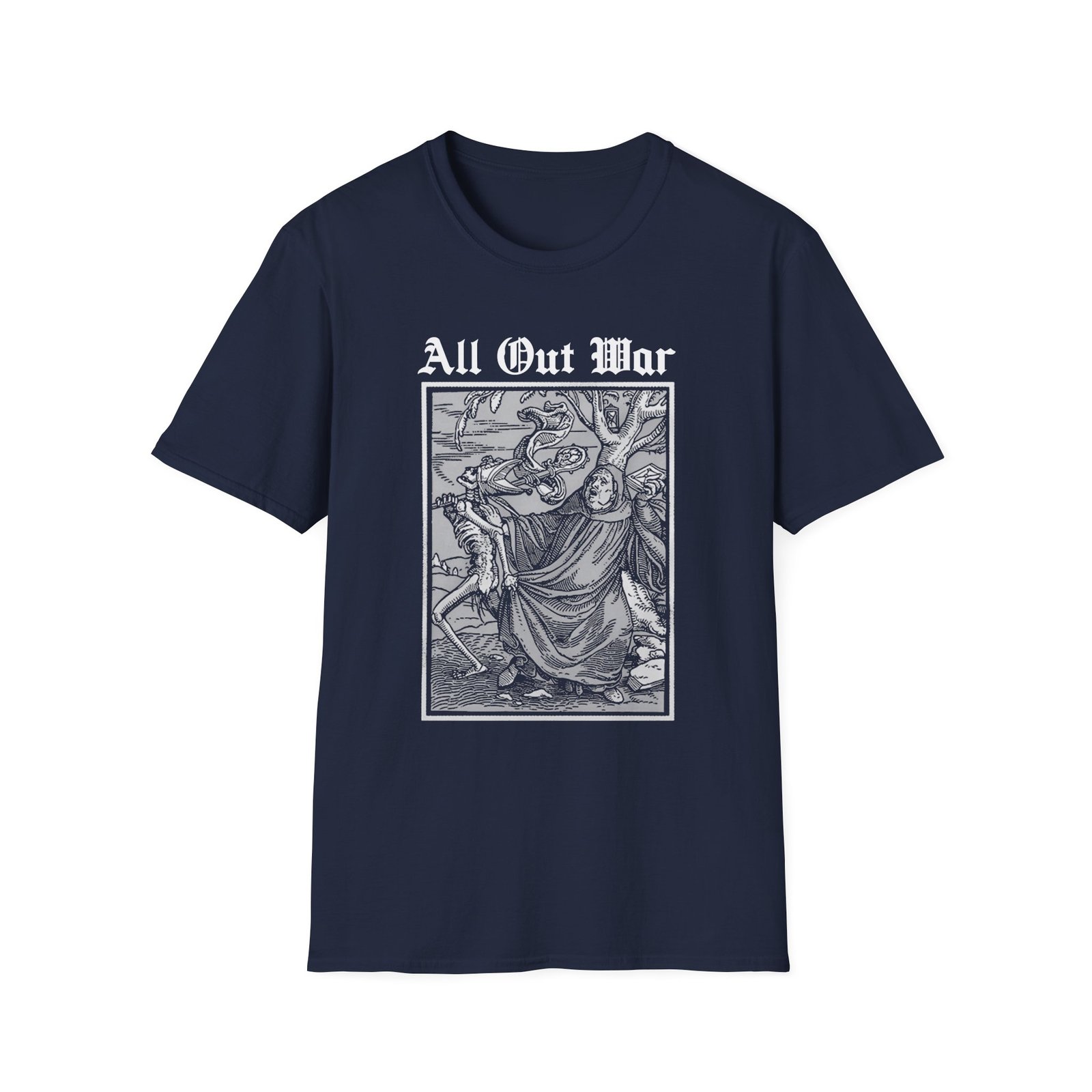 The All Out War Dance of Death unisex soft-style t-shirt puts a new spin on casual comfort. Made from very soft materials, this tee is 100% cotton for solid colors. Heather colors and sports grey include polyester. The shoulders have twill tape for improved durability. There are no side seams. The collar is made with ribbed knitting to prevent curling damage.