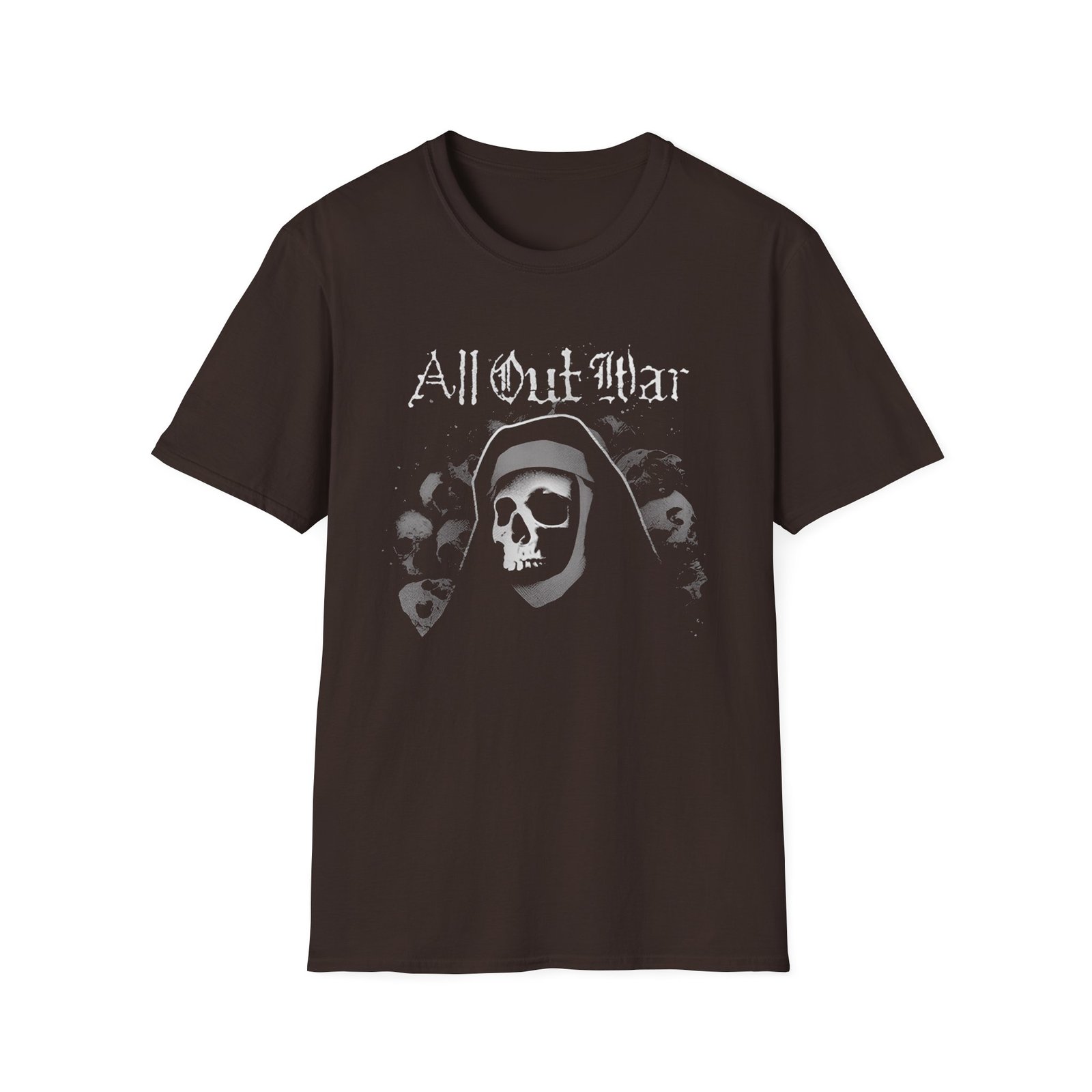 The All Out War Nun Skull unisex soft-style t-shirt puts a new spin on casual comfort. Made from very soft materials, this tee is 100% cotton for solid colors. Heather colors and sports grey include polyester. The shoulders have twill tape for improved durability. There are no side seams. The collar is made with ribbed knitting to prevent curling damage.