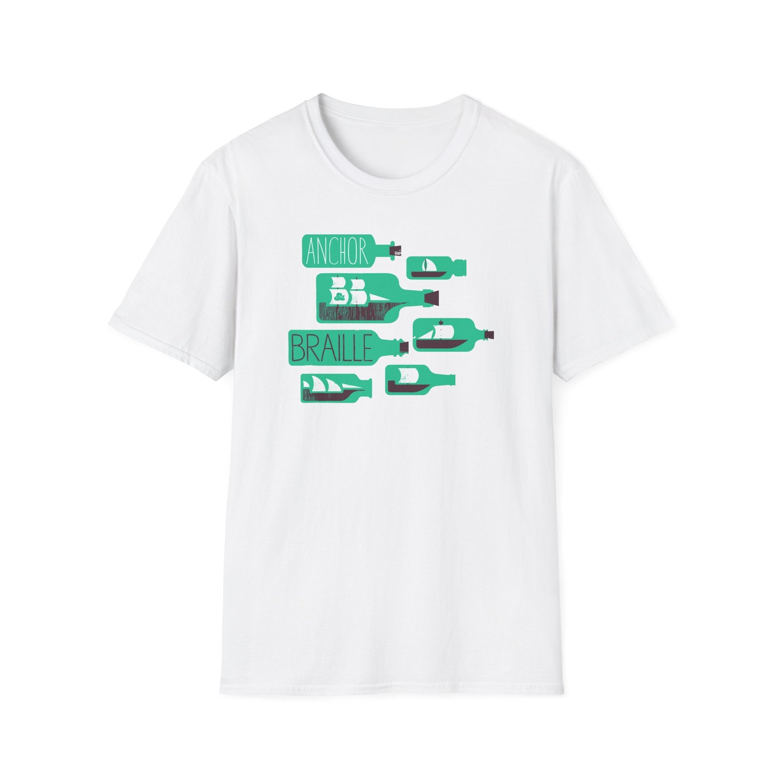 The Anchor and Braille Ships Bottles unisex soft-style t-shirt puts a new spin on casual comfort. Made from very soft materials, this tee is 100% cotton for solid colors. Heather colors and sports grey include polyester. The shoulders have twill tape for improved durability. There are no side seams. The collar is made with ribbed knitting to prevent curling damage.