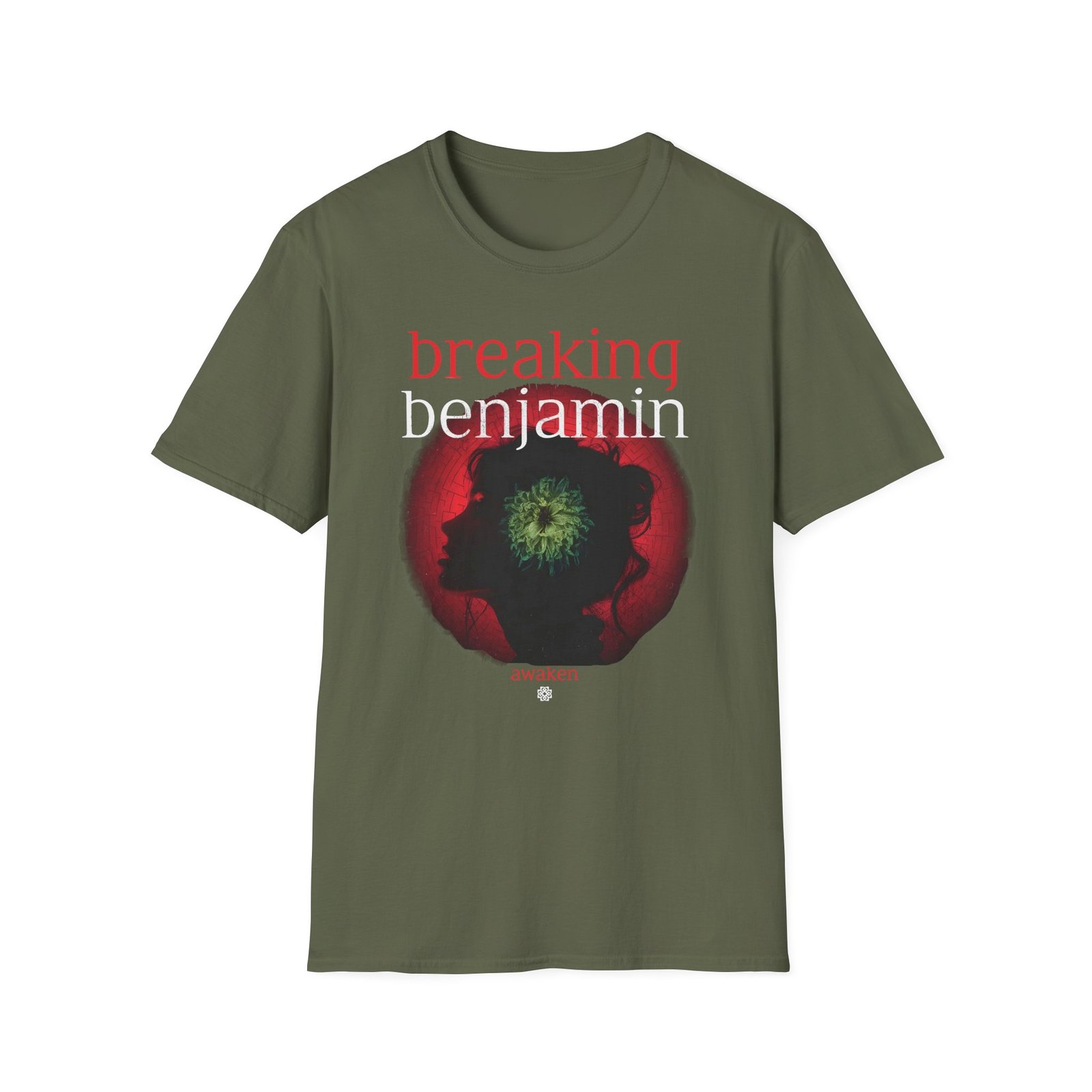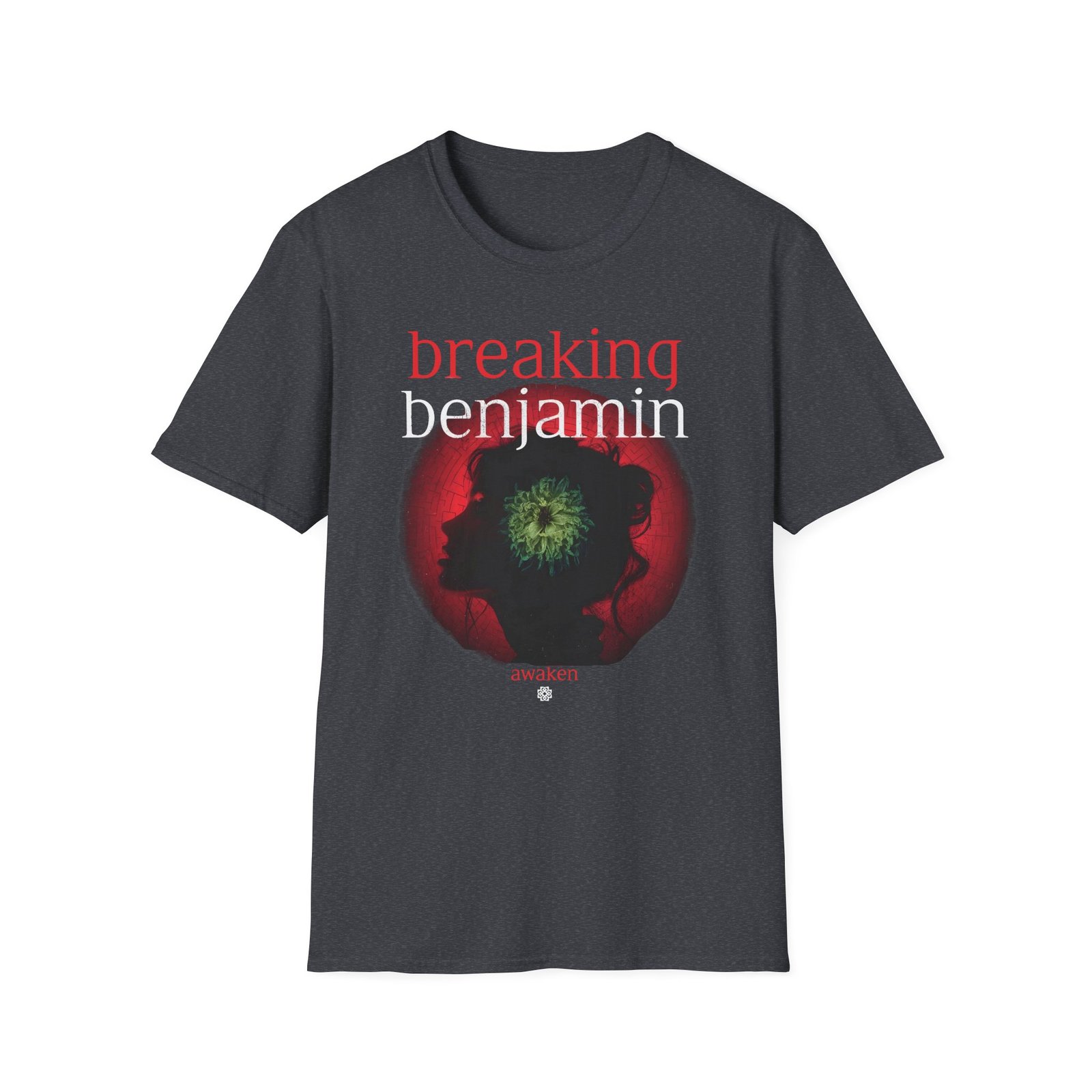 The Breaking Benjamin Awaken unisex soft-style t-shirt puts a new spin on casual comfort. Made from very soft materials, this tee is 100% cotton for solid colors. Heather colors and sports grey include polyester. The shoulders have twill tape for improved durability. There are no side seams. The collar is made with ribbed knitting to prevent curling damage.