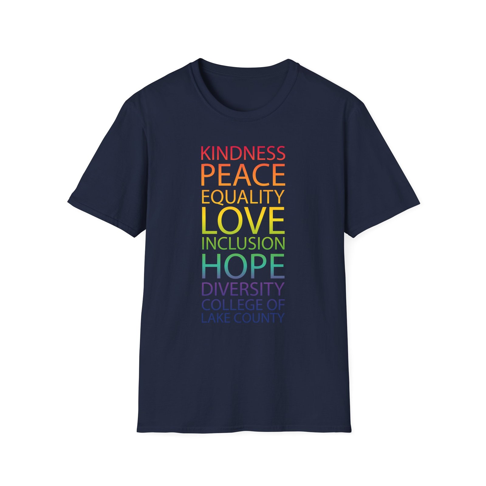 The College Lake County Rainbow Equality unisex soft-style t-shirt puts a new spin on casual comfort. Made from very soft materials, this tee is 100% cotton for solid colors. Heather colors and sports grey include polyester. The shoulders have twill tape for improved durability. There are no side seams. The collar is made with ribbed knitting to prevent curling damage.