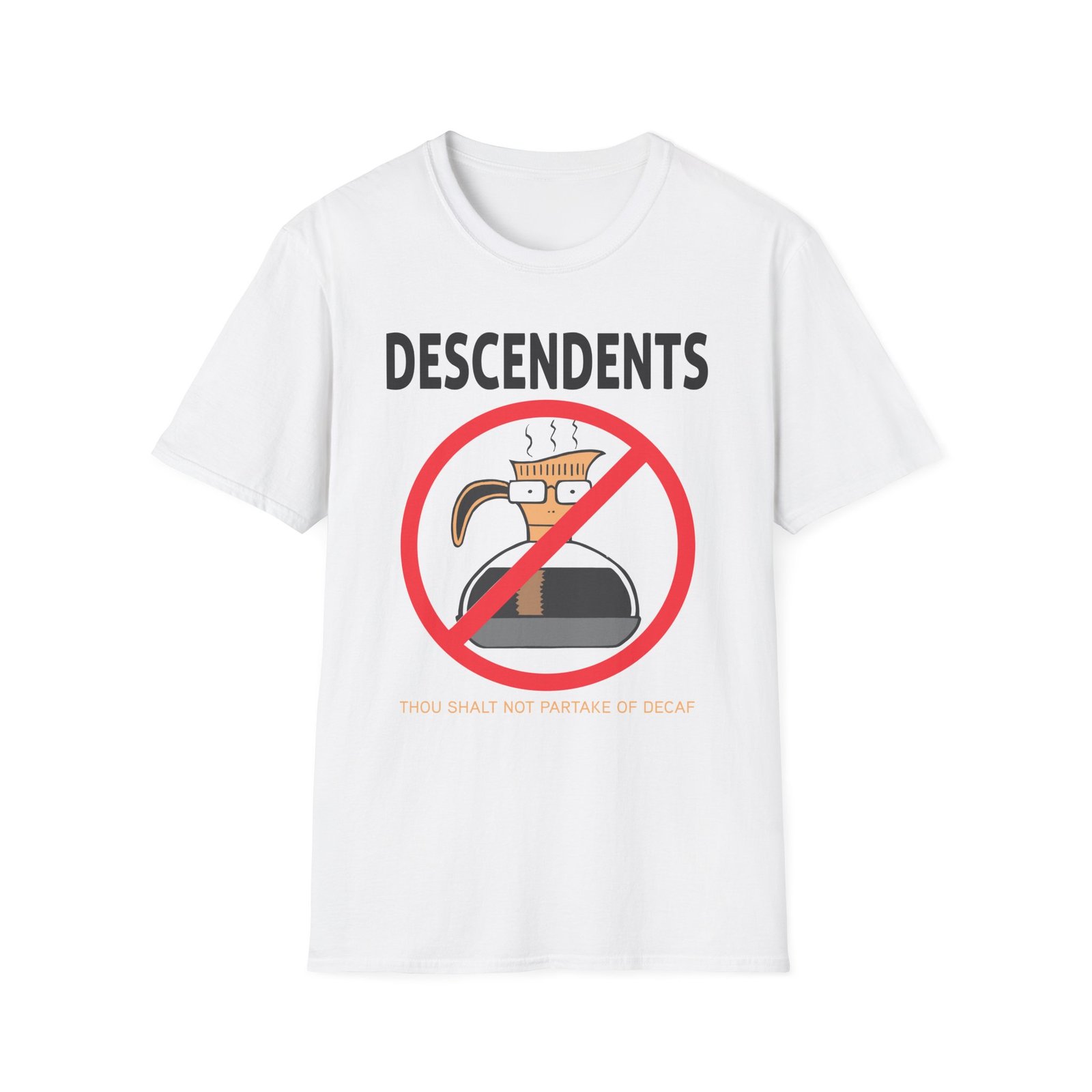 The Descendents Decaf unisex soft-style t-shirt puts a new spin on casual comfort. Made from very soft materials, this tee is 100% cotton for solid colors. Heather colors and sports grey include polyester. The shoulders have twill tape for improved durability. There are no side seams. The collar is made with ribbed knitting to prevent curling damage.