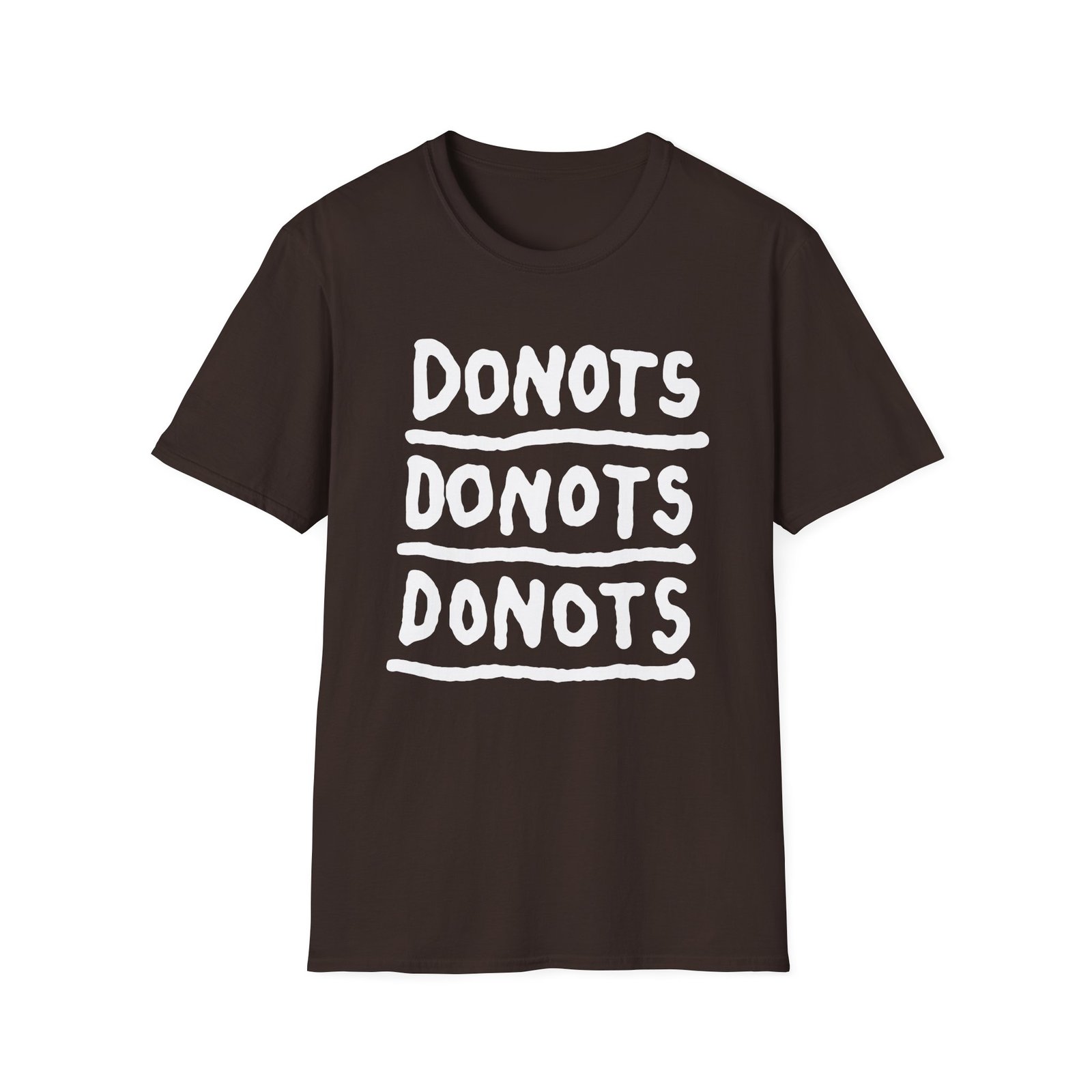 The Donots Triple Logo unisex soft-style t-shirt puts a new spin on casual comfort. Made from very soft materials, this tee is 100% cotton for solid colors. Heather colors and sports grey include polyester. The shoulders have twill tape for improved durability. There are no side seams. The collar is made with ribbed knitting to prevent curling damage.