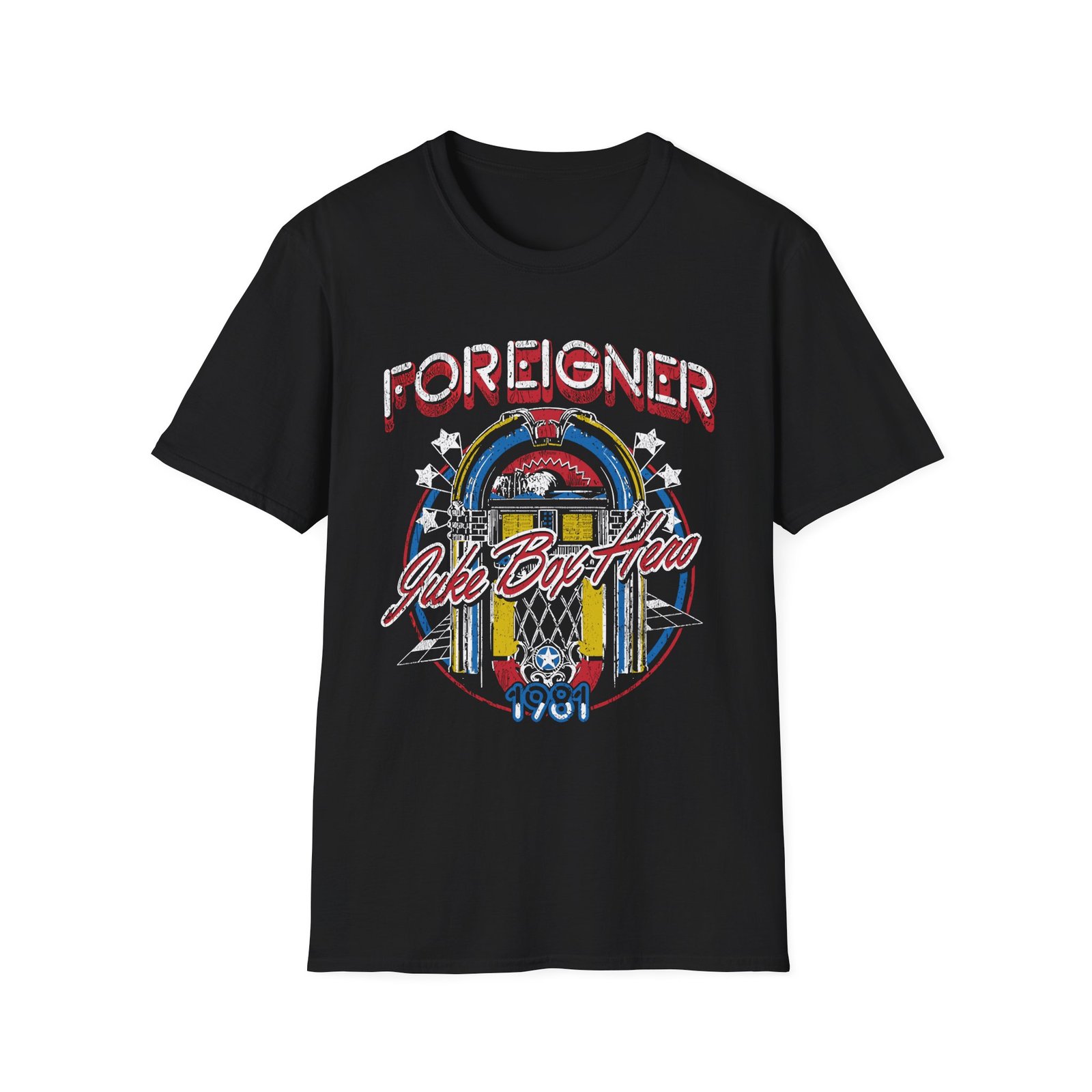 The Foreigner Juke Box Hero unisex soft-style t-shirt puts a new spin on casual comfort. Made from very soft materials, this tee is 100% cotton for solid colors. Heather colors and sports grey include polyester. The shoulders have twill tape for improved durability. There are no side seams. The collar is made with ribbed knitting to prevent curling damage.