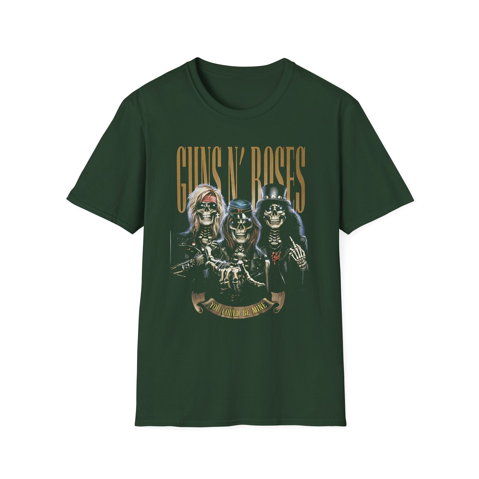 The Guns N Roses You Could Be Mine unisex soft-style t-shirt puts a new spin on casual comfort. Made from very soft materials, this tee is 100% cotton for solid colors. Heather colors and sports grey include polyester. The shoulders have twill tape for improved durability. There are no side seams. The collar is made with ribbed knitting to prevent curling damage.