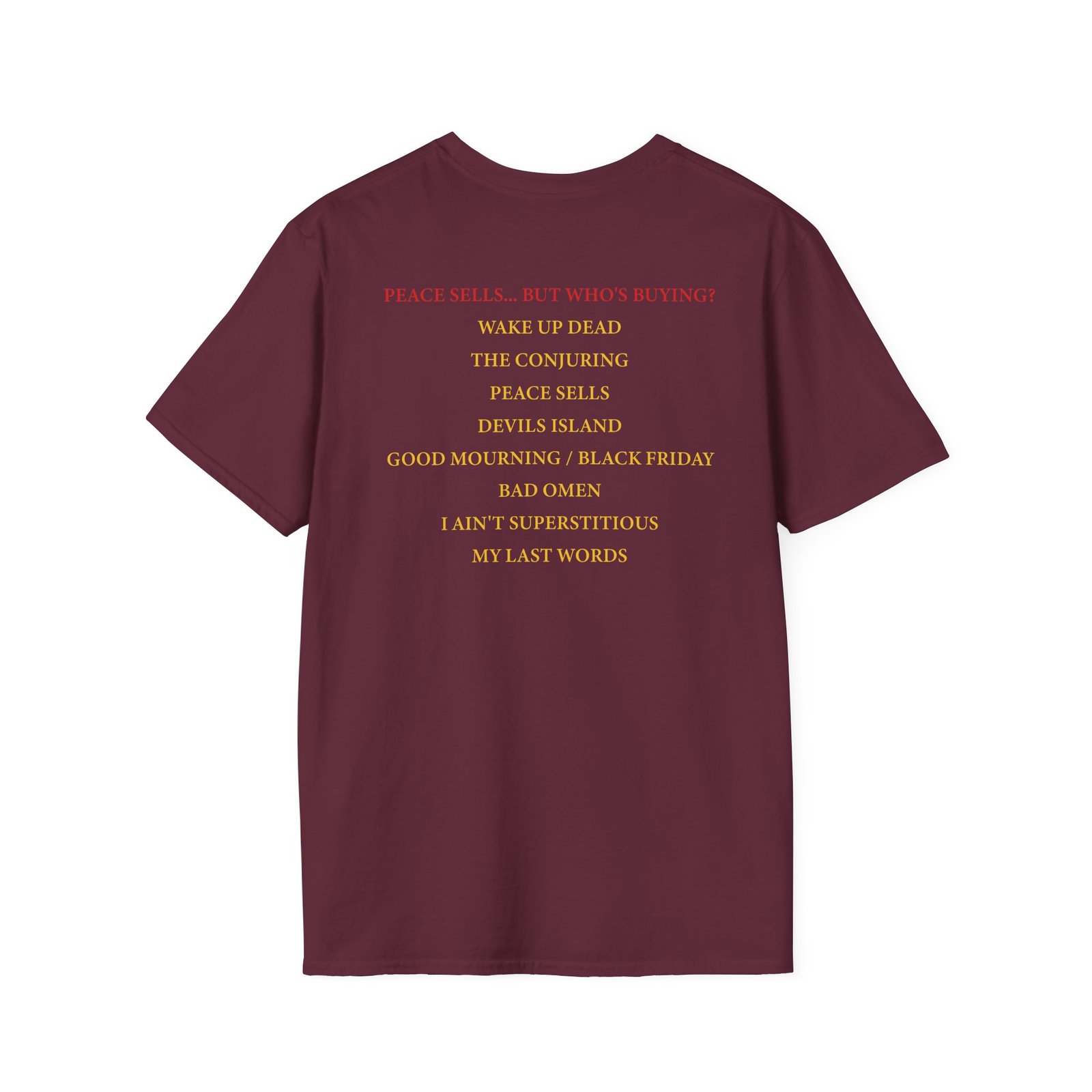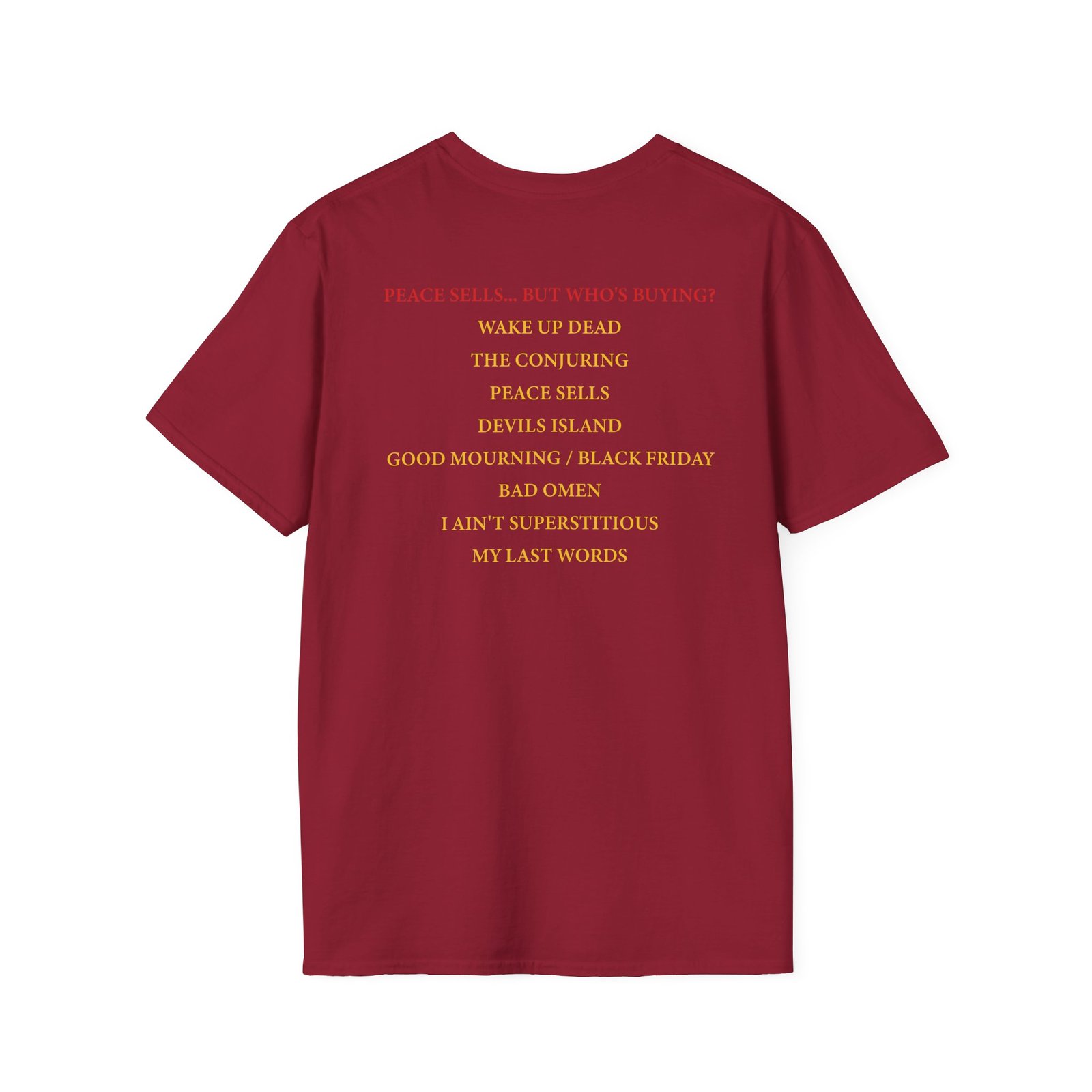 The Megadeth Peace Sells Tracklist Unisex Softstyle T-Shirt puts a new spin on casual comfort. Made from very soft materials, this tee is 100% cotton for solid colors. Heather colors and sports grey include polyester. The shoulders have twill tape for improved durability. There are no side seams. The collar is made with ribbed knitting to prevent curling damage.