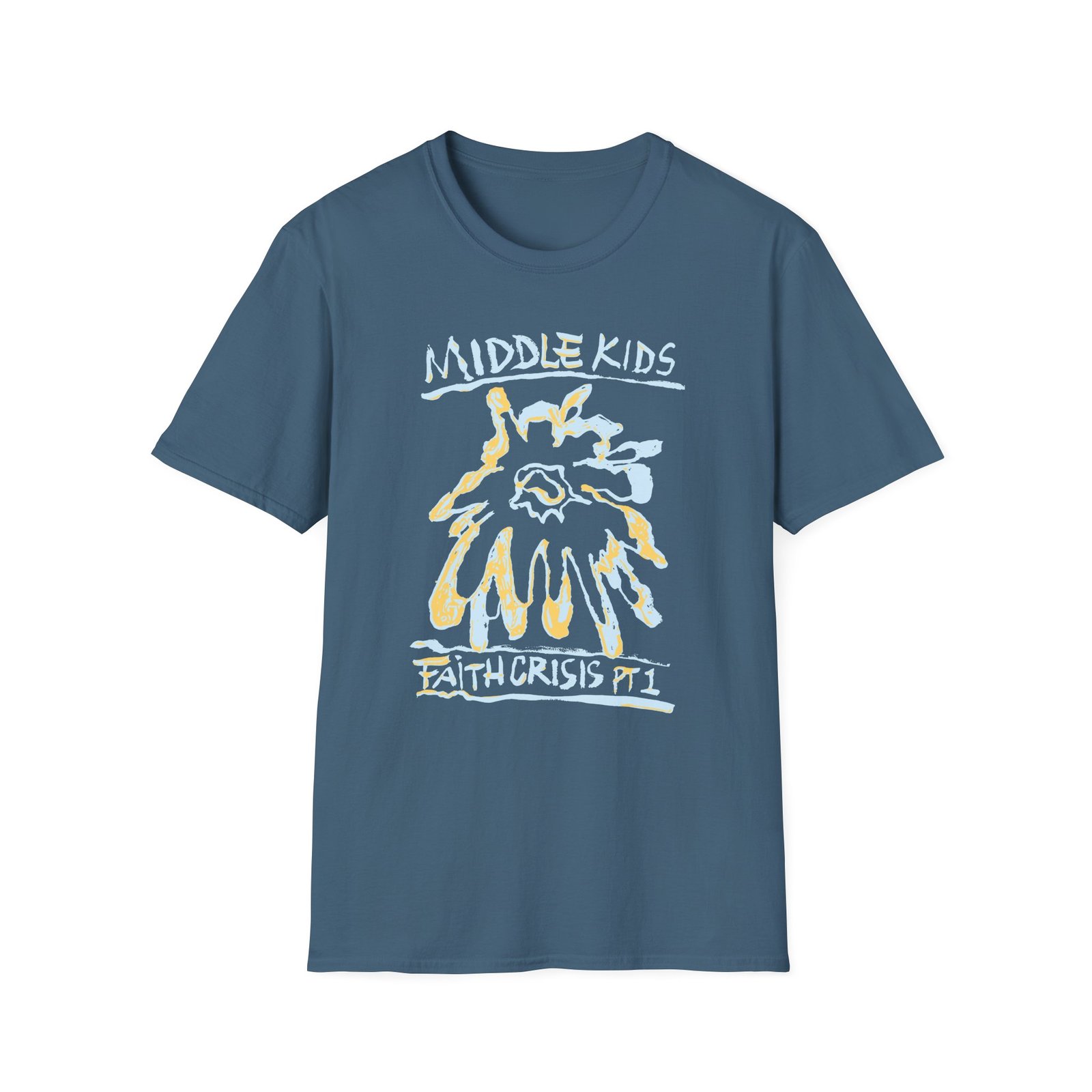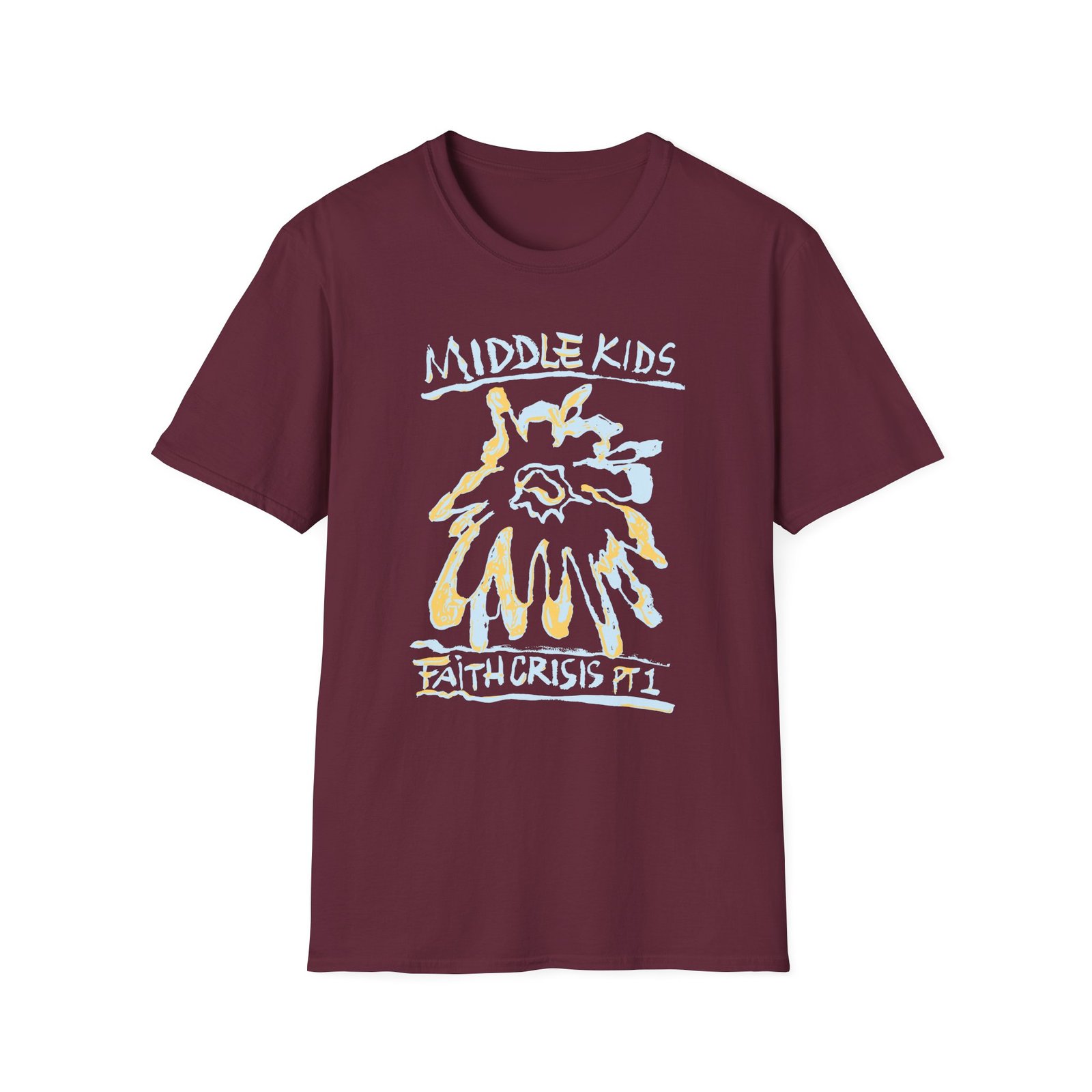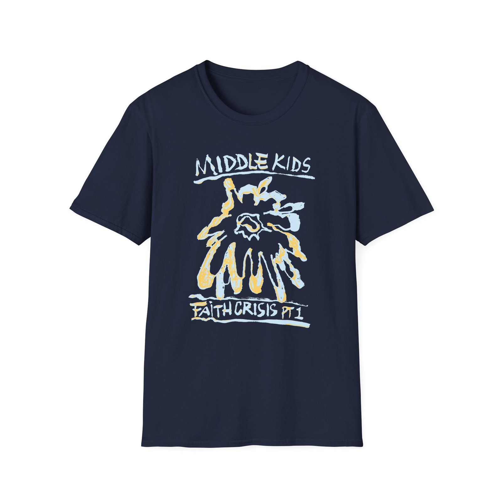The Middle Kids Faith Crisis Regional Tour unisex soft-style t-shirt puts a new spin on casual comfort. Made from very soft materials, this tee is 100% cotton for solid colors. Heather colors and sports grey include polyester. The shoulders have twill tape for improved durability. There are no side seams. The collar is made with ribbed knitting to prevent curling damage.