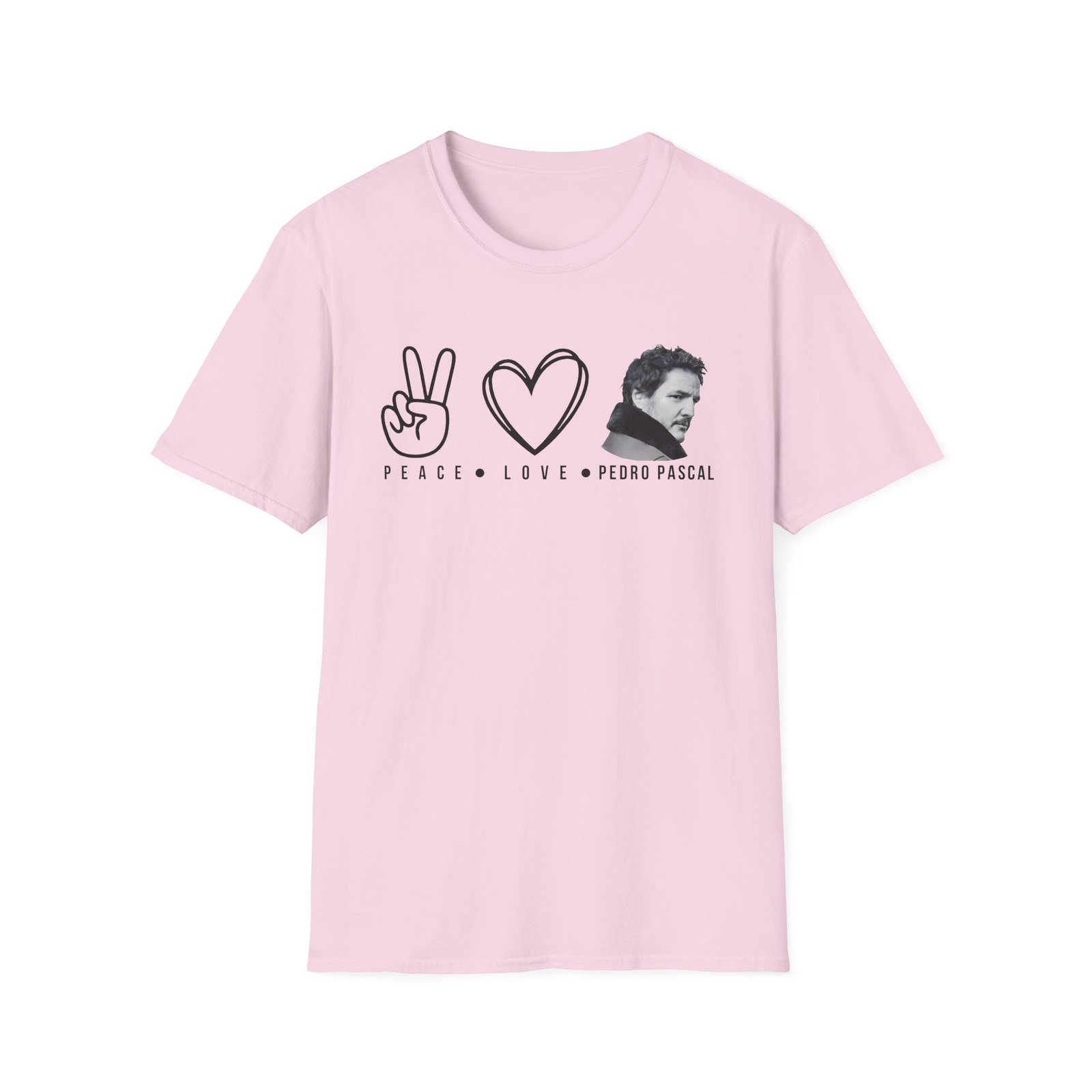 The Peace Love Pedro Pascal unisex soft-style t-shirt puts a new spin on casual comfort. Made from very soft materials, this tee is 100% cotton for solid colors. Heather colors and sports grey include polyester. The shoulders have twill tape for improved durability. There are no side seams. The collar is made with ribbed knitting to prevent curling damage.