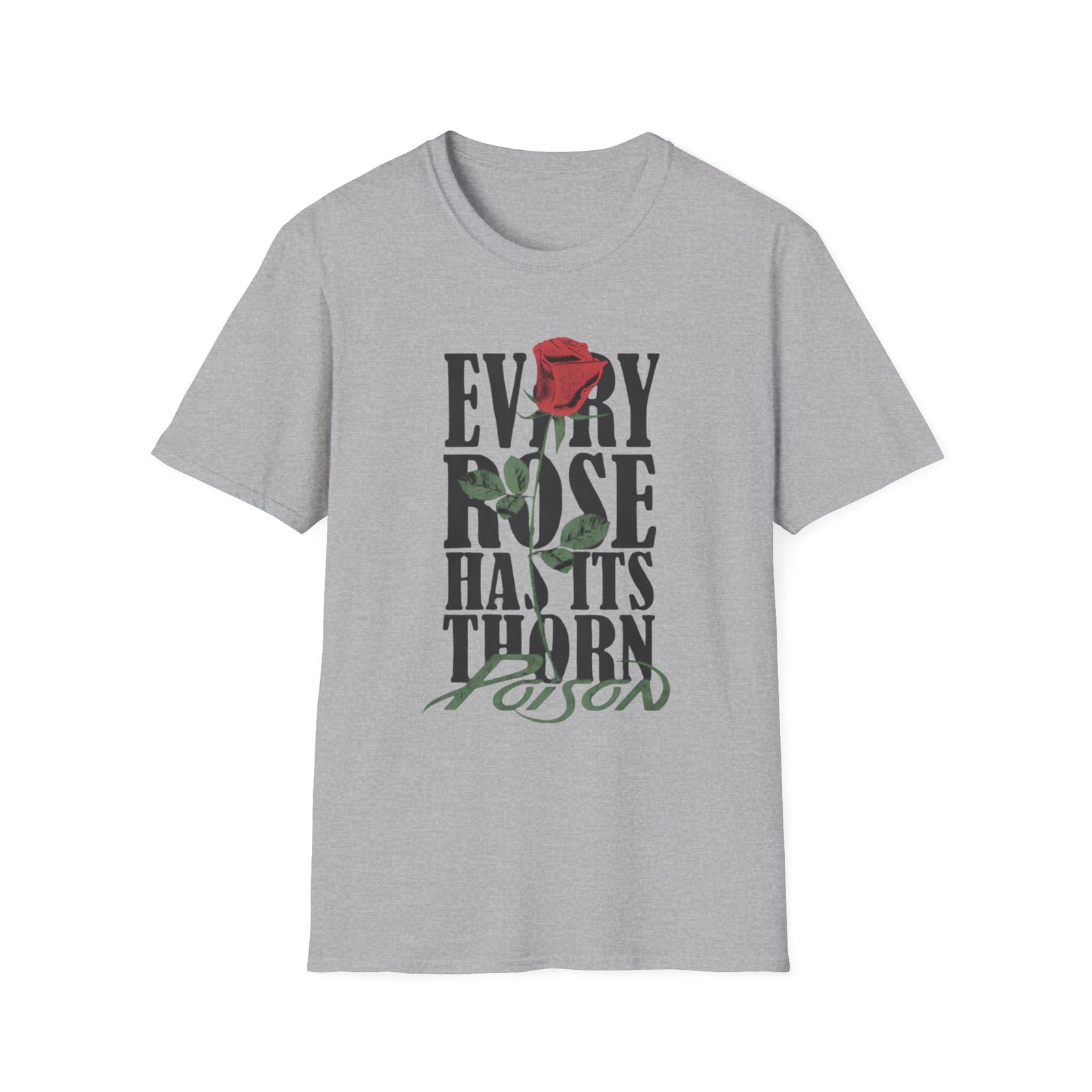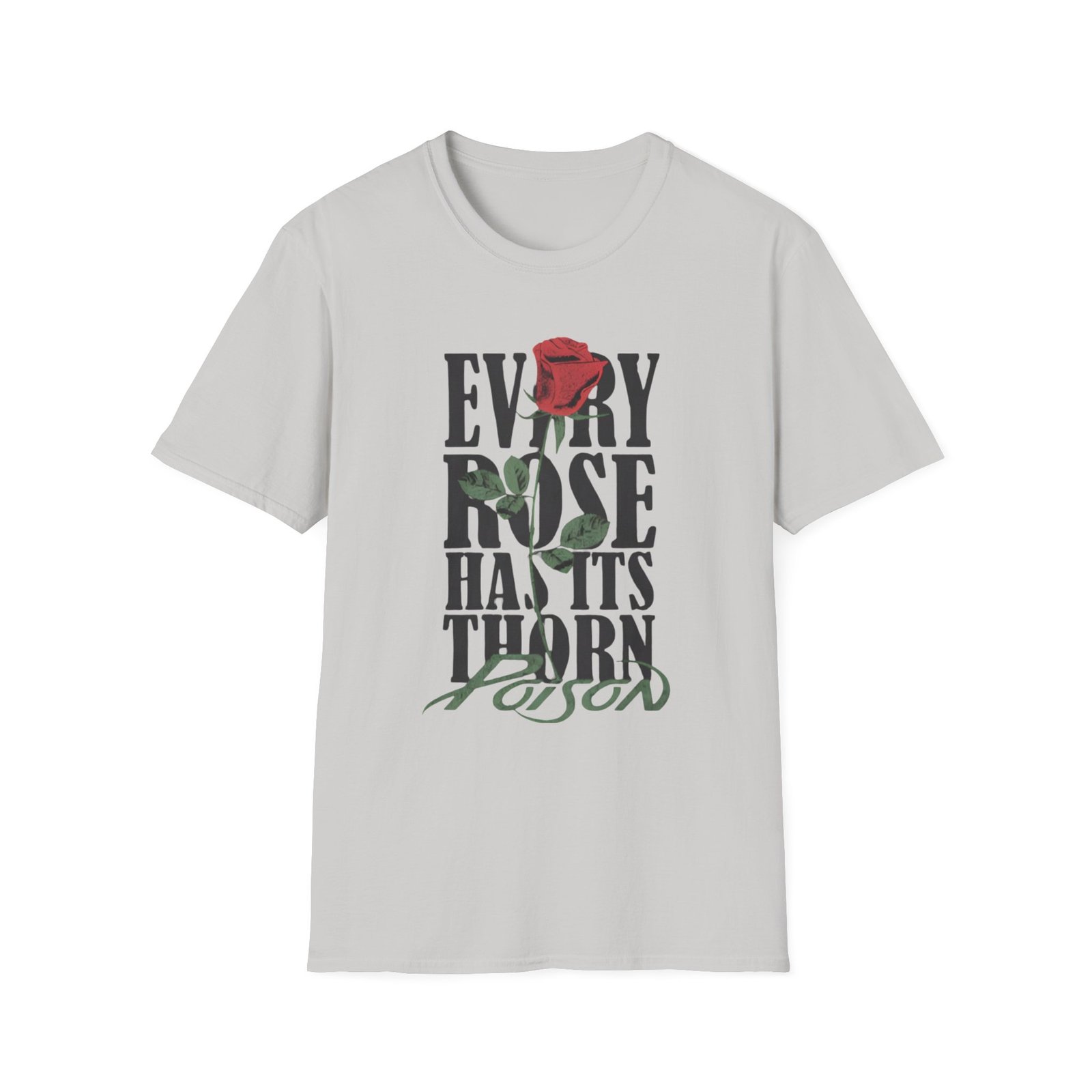 The Poison Every Rose Thorn unisex soft-style t-shirt puts a new spin on casual comfort. Made from very soft materials, this tee is 100% cotton for solid colors. Heather colors and sports grey include polyester. The shoulders have twill tape for improved durability. There are no side seams. The collar is made with ribbed knitting to prevent curling damage.
