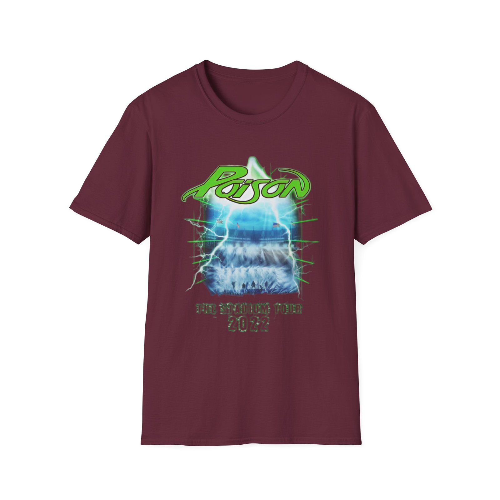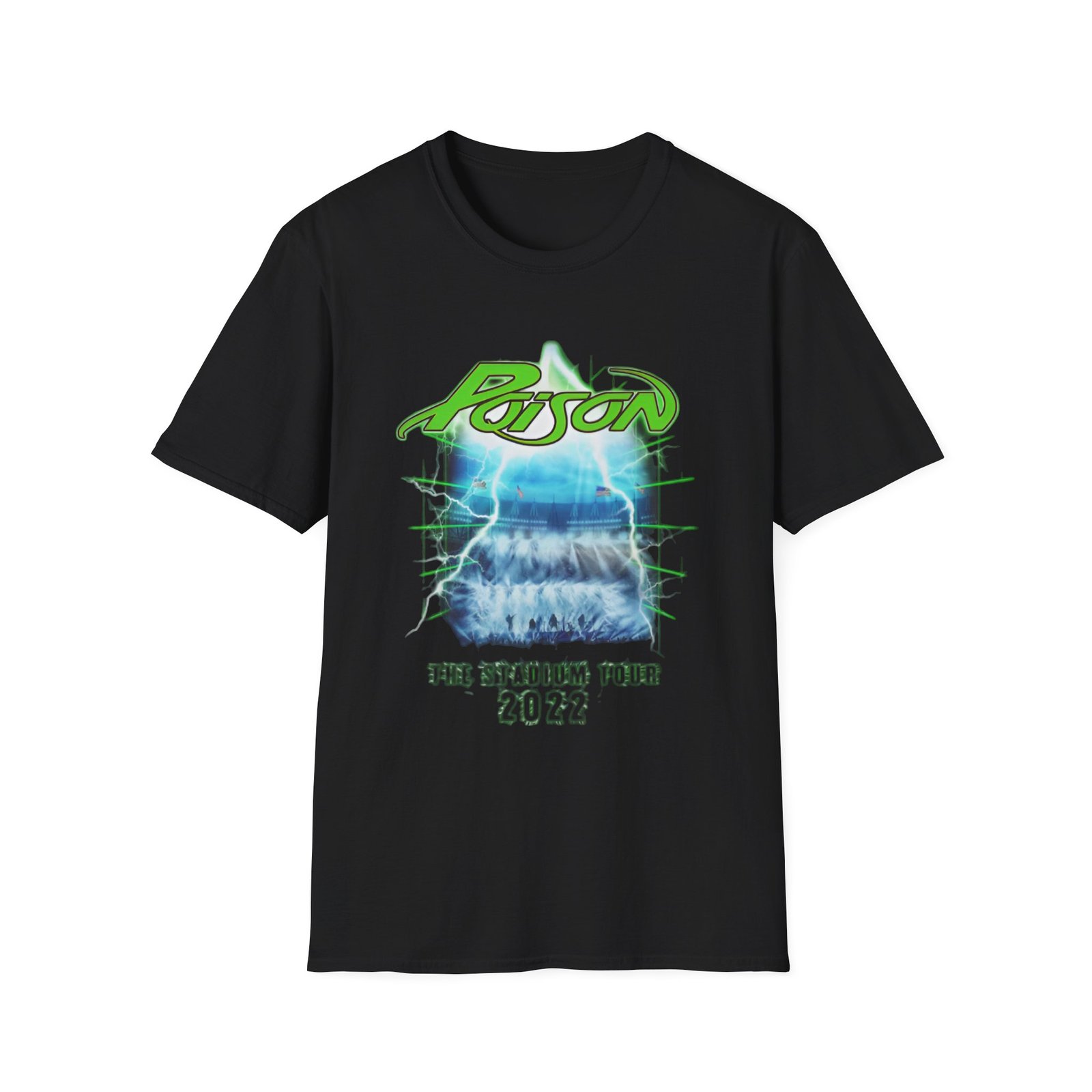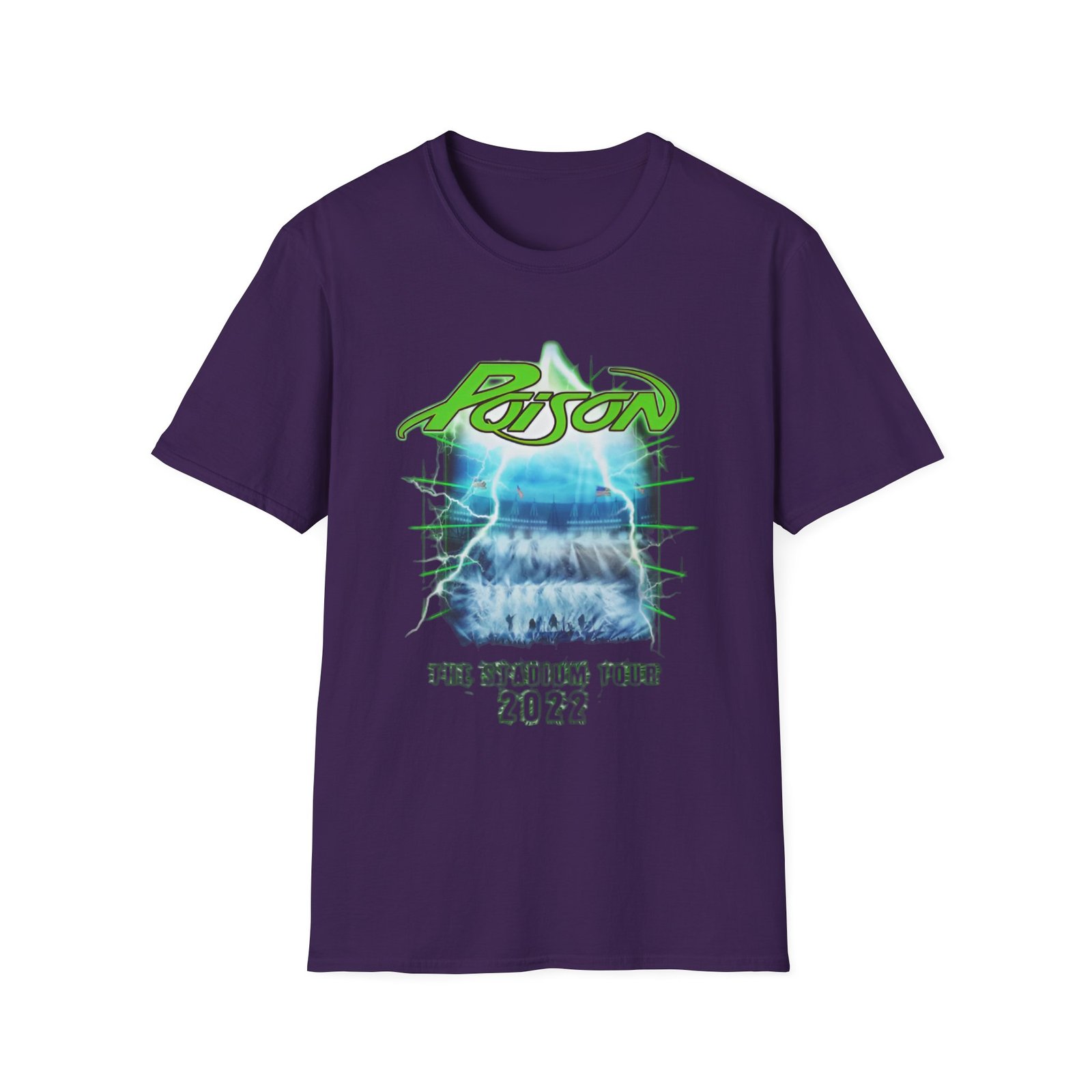 The Poison Stadium Tour unisex soft-style t-shirt puts a new spin on casual comfort. Made from very soft materials, this tee is 100% cotton for solid colors. Heather colors and sports grey include polyester. The shoulders have twill tape for improved durability. There are no side seams. The collar is made with ribbed knitting to prevent curling damage.