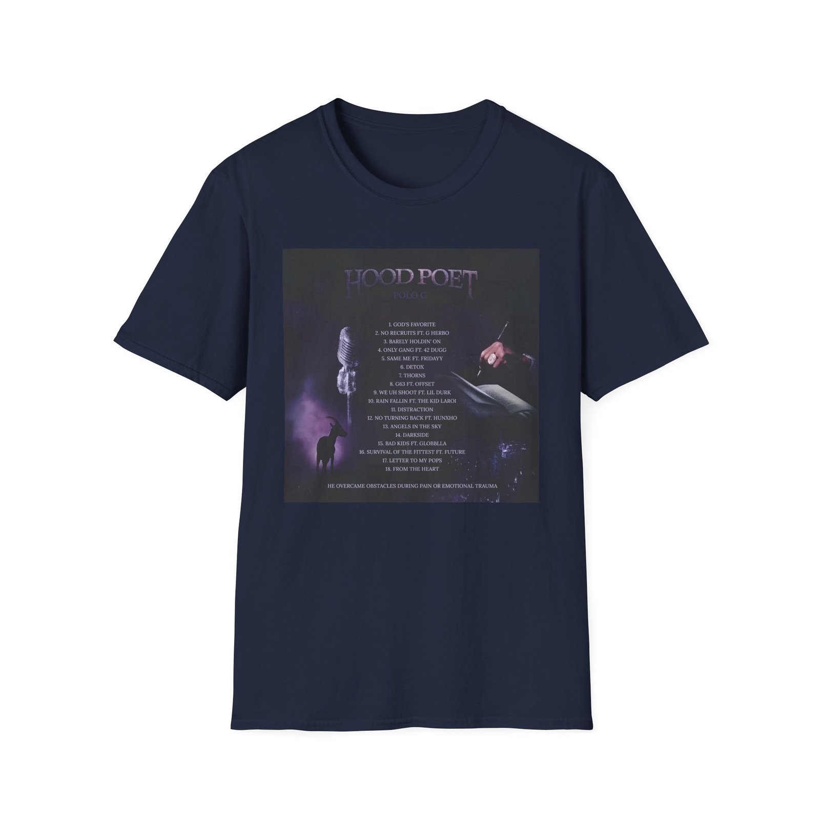 The Polo G Hood Poet unisex soft-style t-shirt puts a new spin on casual comfort. Made from very soft materials, this tee is 100% cotton for solid colors. Heather colors and sports grey include polyester. The shoulders have twill tape for improved durability. There are no side seams. The collar is made with ribbed knitting to prevent curling damage.