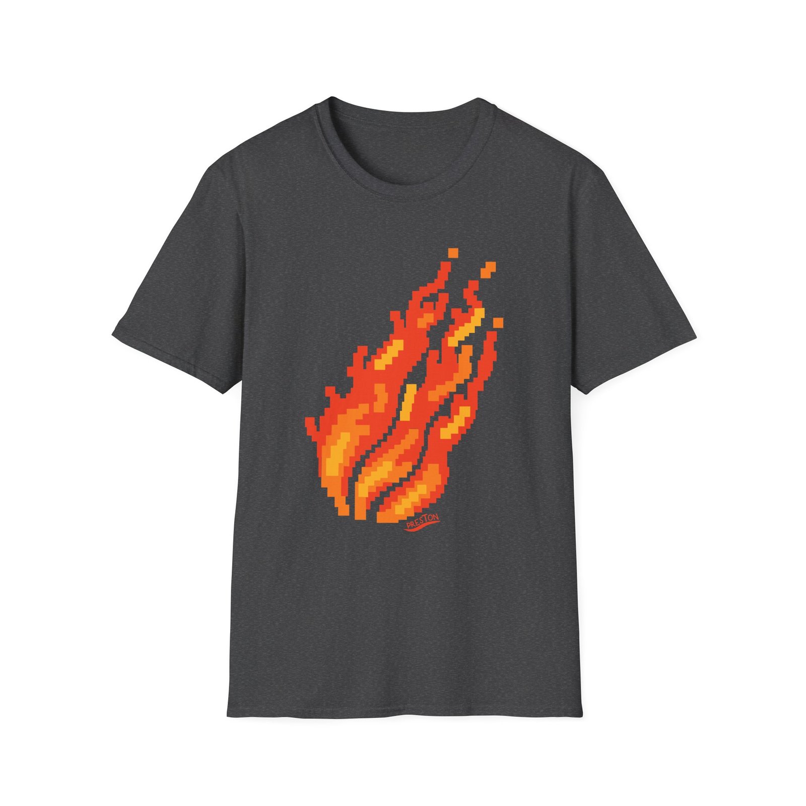 The Preston Pixel Flame unisex soft-style t-shirt puts a new spin on casual comfort. Made from very soft materials, this tee is 100% cotton for solid colors. Heather colors and sports grey include polyester. The shoulders have twill tape for improved durability. There are no side seams. The collar is made with ribbed knitting to prevent curling damage.