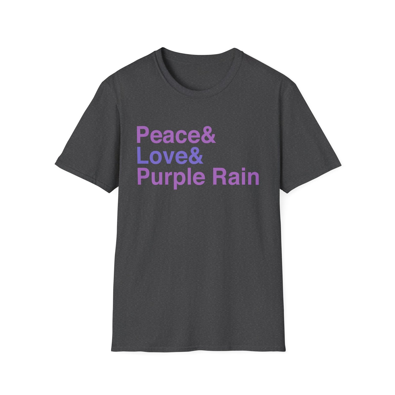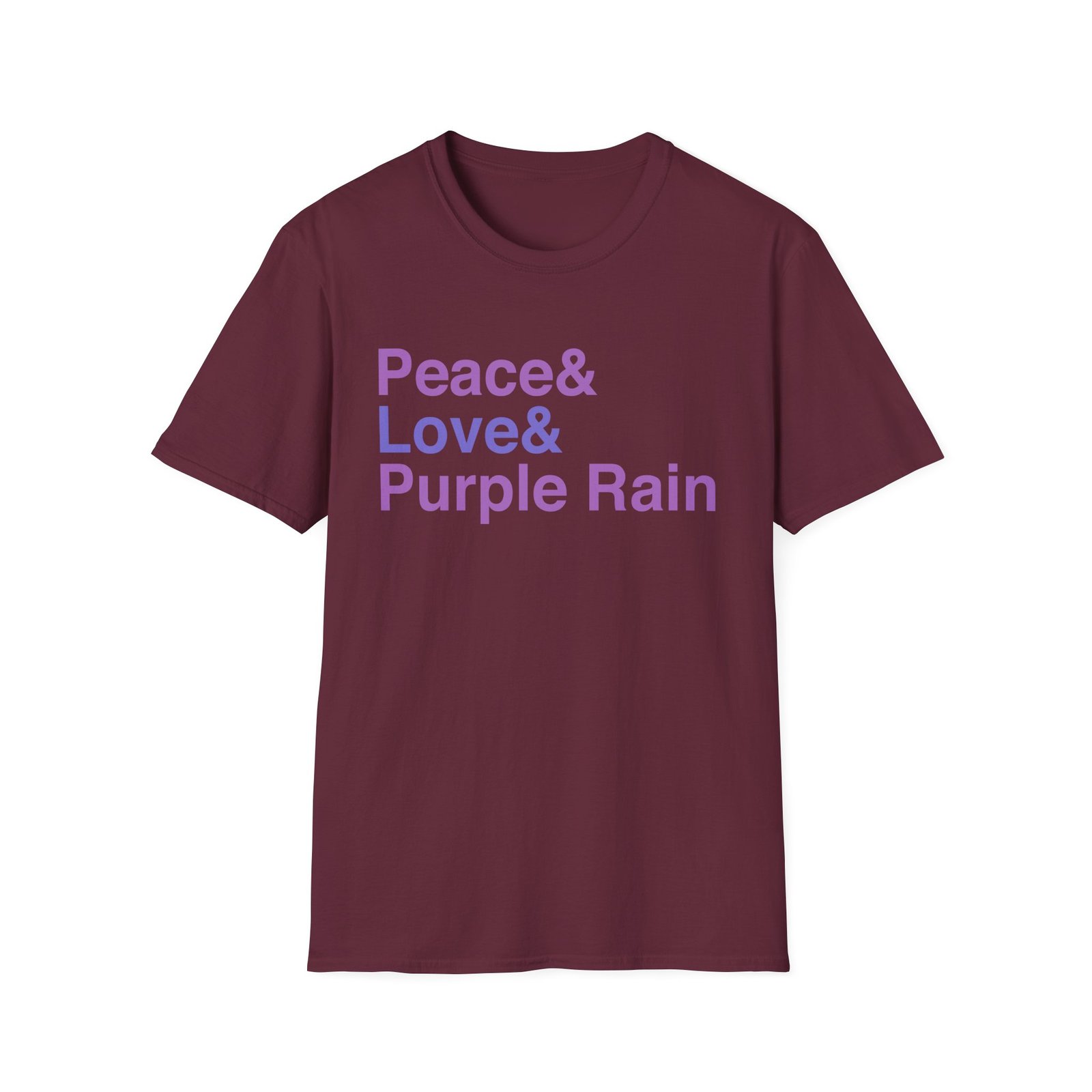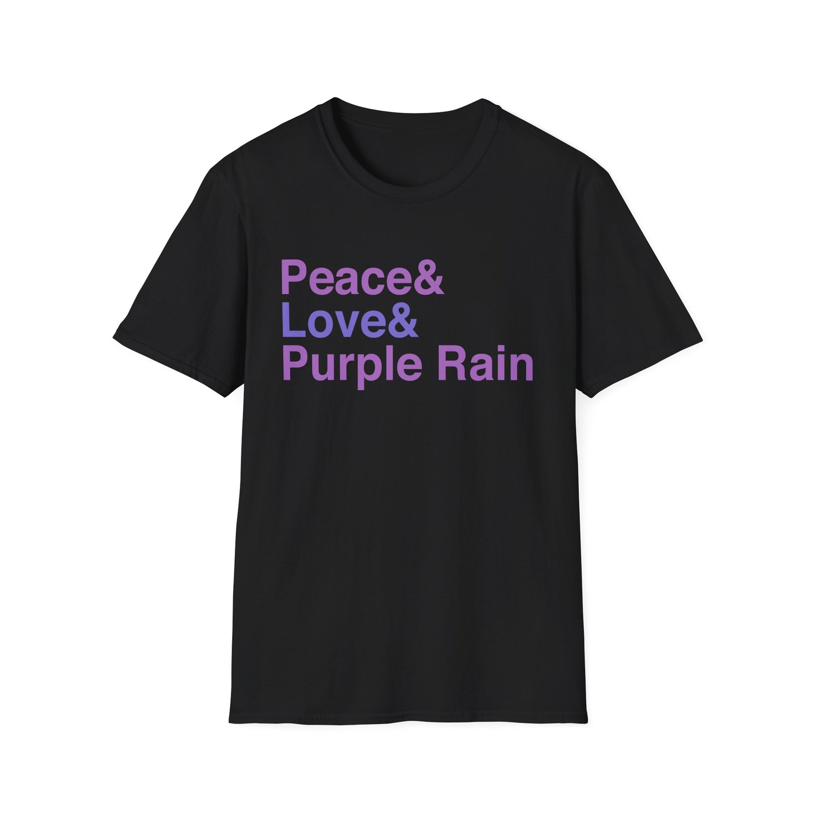 The Prince & Love & Purple Rain unisex soft-style t-shirt puts a new spin on casual comfort. Made from very soft materials, this tee is 100% cotton for solid colors. Heather colors and sports grey include polyester. The shoulders have twill tape for improved durability. There are no side seams. The collar is made with ribbed knitting to prevent curling damage.