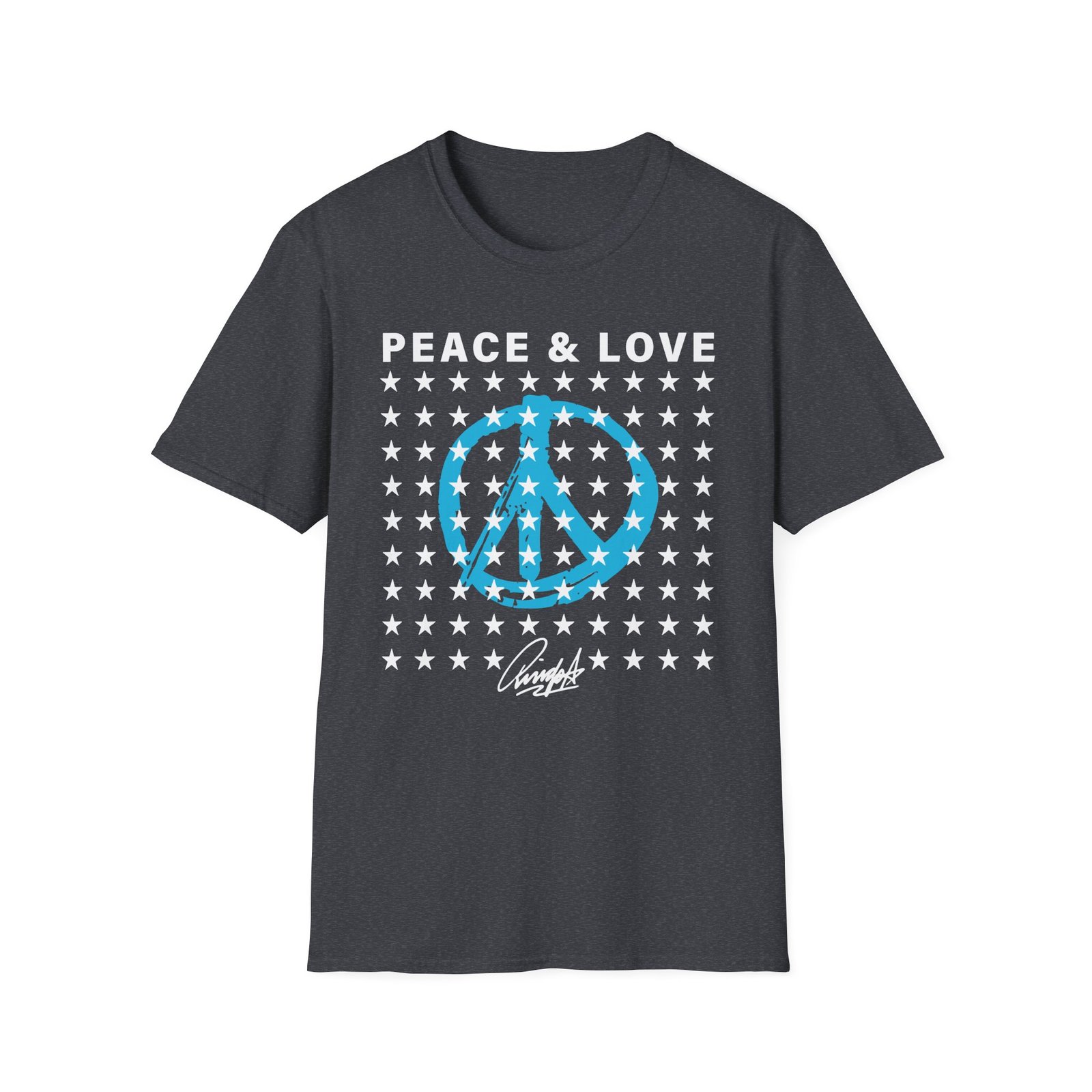 The Ringo Starr Peace & Love Stars unisex soft-style t-shirt puts a new spin on casual comfort. Made from very soft materials, this tee is 100% cotton for solid colors. Heather colors and sports grey include polyester. The shoulders have twill tape for improved durability. There are no side seams. The collar is made with ribbed knitting to prevent curling damage.