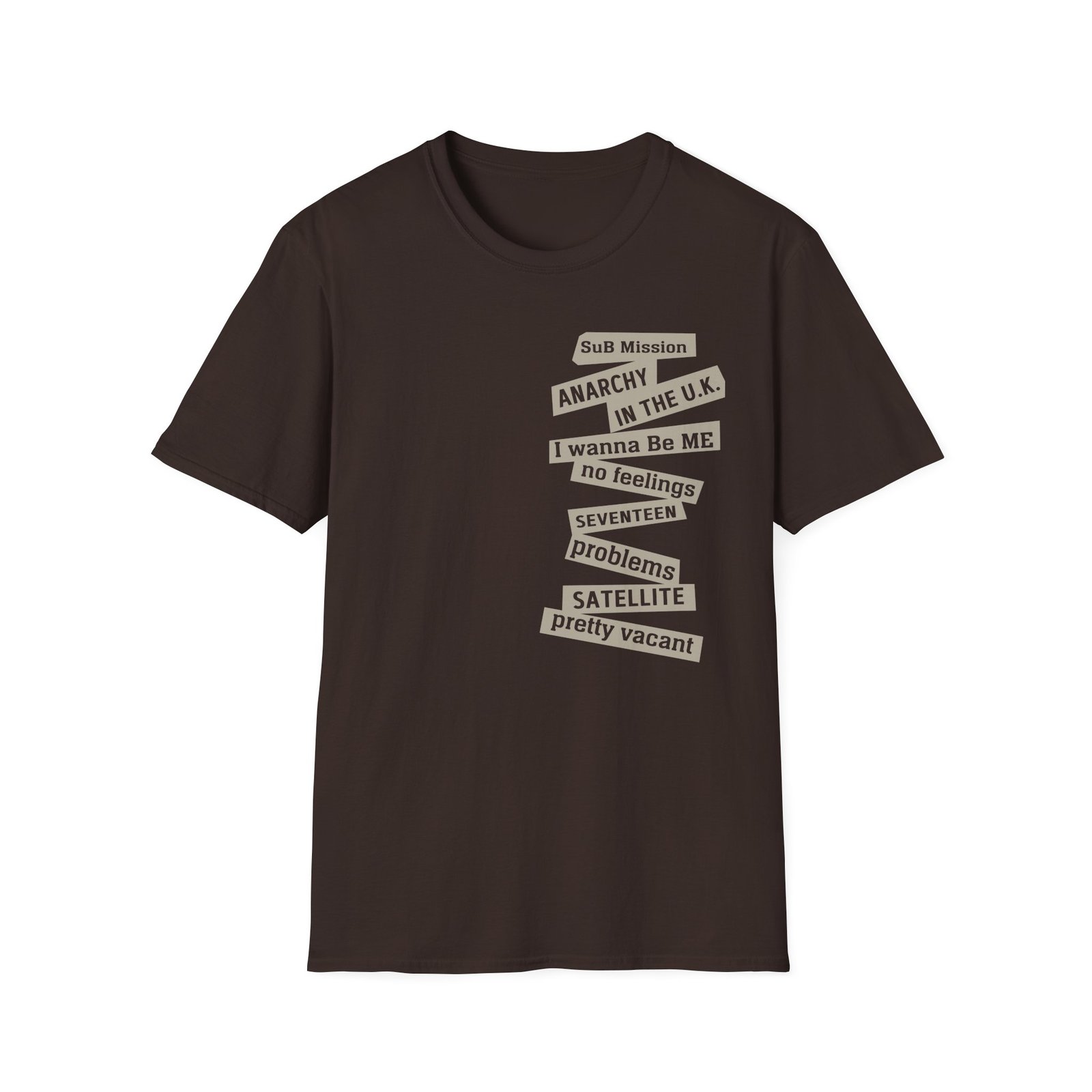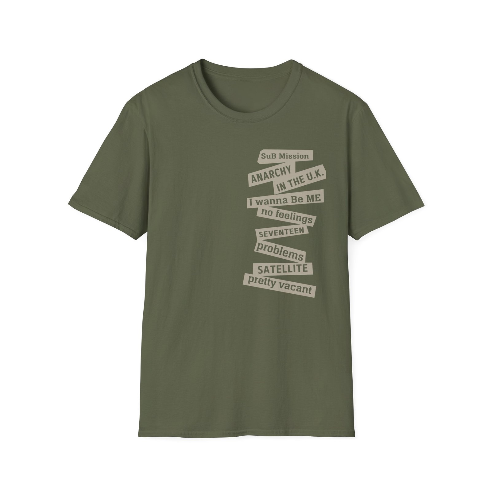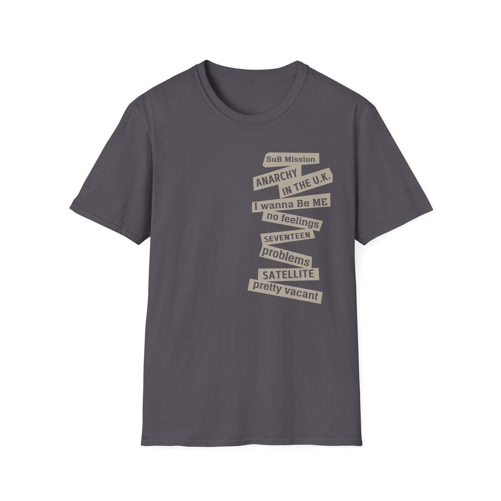 The SP Song Titles unisex soft-style t-shirt puts a new spin on casual comfort. Made from very soft materials, this tee is 100% cotton for solid colors. Heather colors and sports grey include polyester. The shoulders have twill tape for improved durability. There are no side seams. The collar is made with ribbed knitting to prevent curling damage.