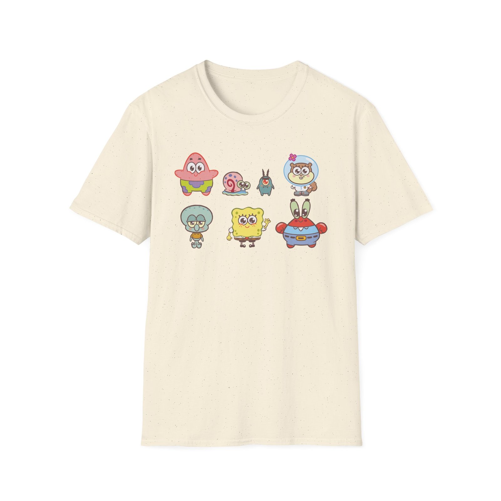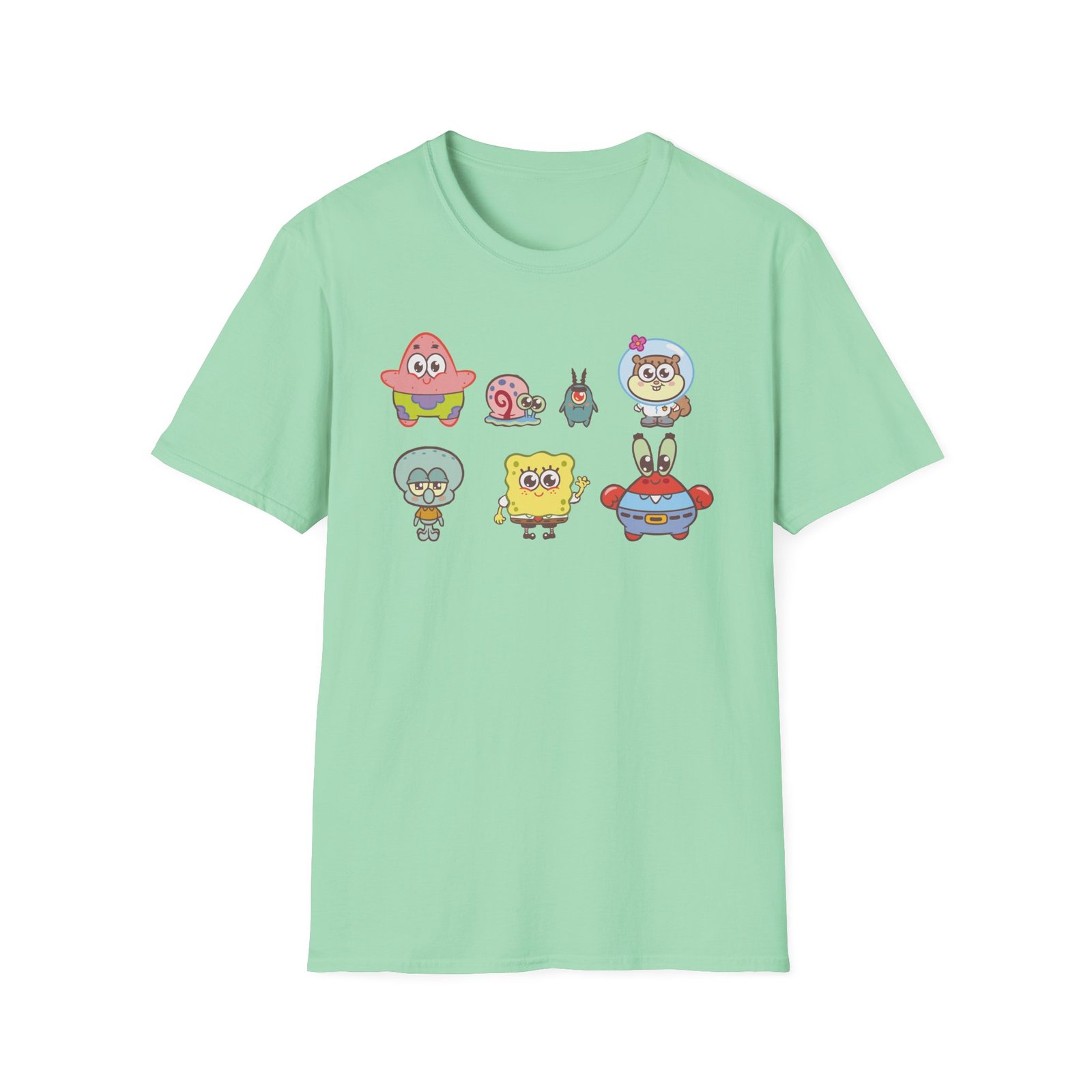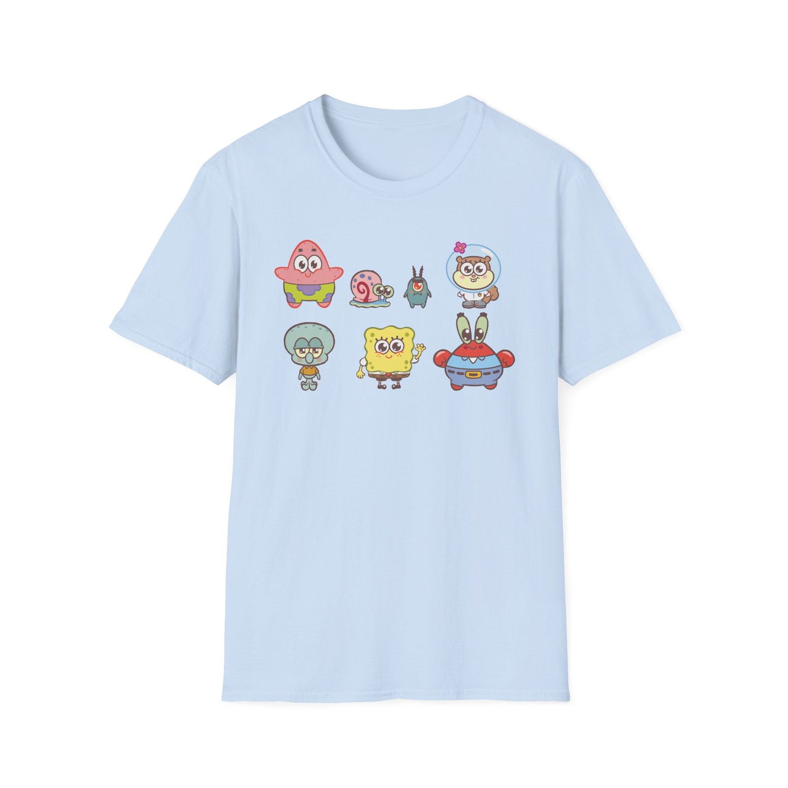The Spongebob AdoraBob Gang Unisex Softstyle T-Shirt puts a new spin on casual comfort. Made from very soft materials, this tee is 100% cotton for solid colors. Heather colors and sports grey include polyester. The shoulders have twill tape for improved durability. There are no side seams. The collar is made with ribbed knitting to prevent curling damage.