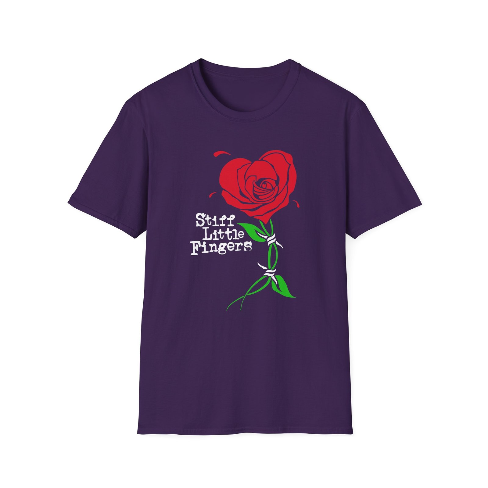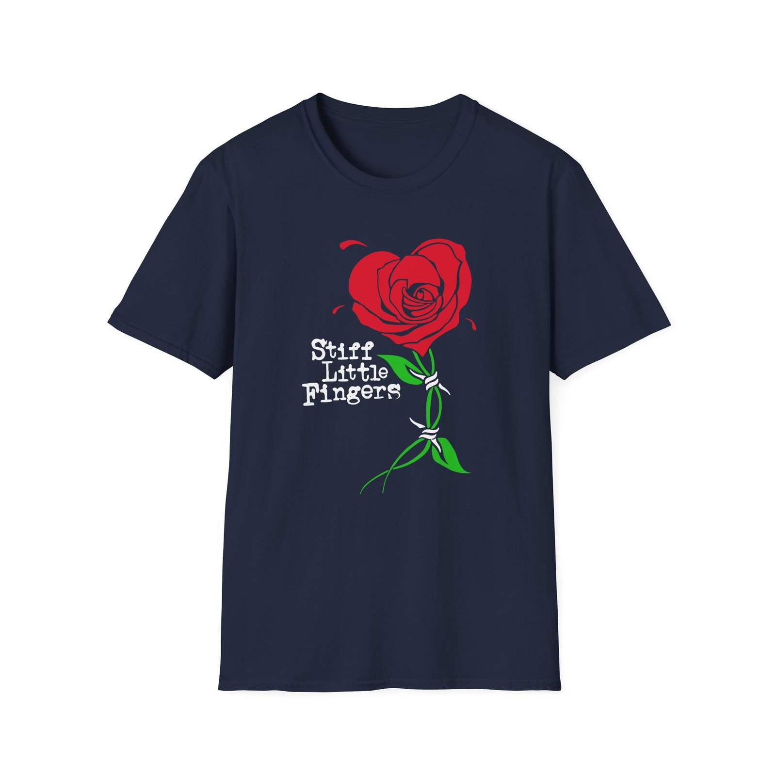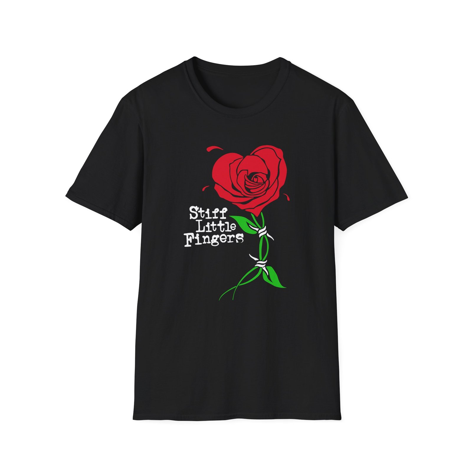 The Stiff Little Fingers Barbed Rose unisex soft-style t-shirt puts a new spin on casual comfort. Made from very soft materials, this tee is 100% cotton for solid colors. Heather colors and sports grey include polyester. The shoulders have twill tape for improved durability. There are no side seams. The collar is made with ribbed knitting to prevent curling damage.