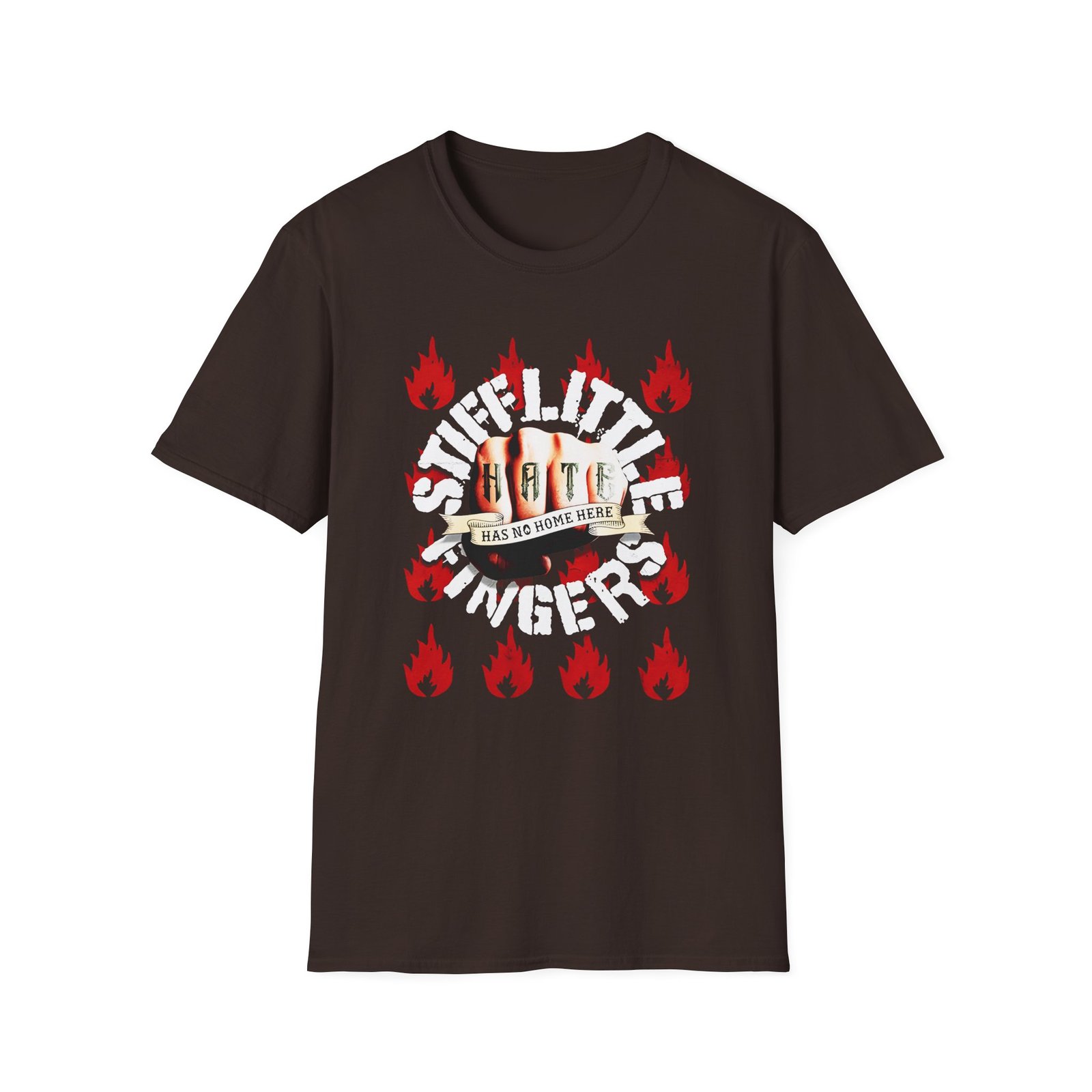 The Stiff Little Fingers Hate Has No Home Here unisex soft-style t-shirt puts a new spin on casual comfort. Made from very soft materials, this tee is 100% cotton for solid colors. Heather colors and sports grey include polyester. The shoulders have twill tape for improved durability. There are no side seams. The collar is made with ribbed knitting to prevent curling damage.