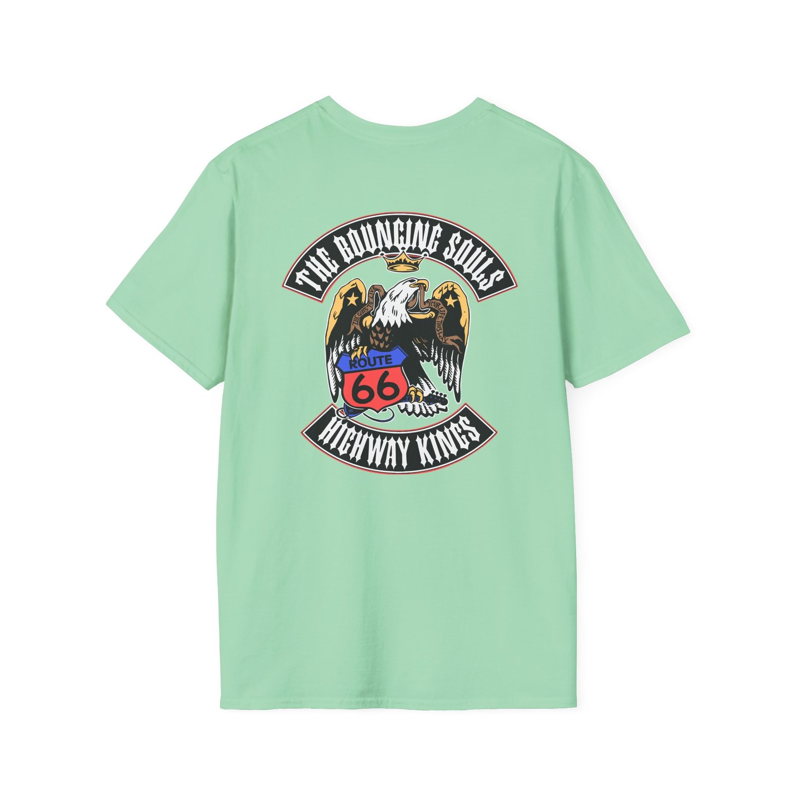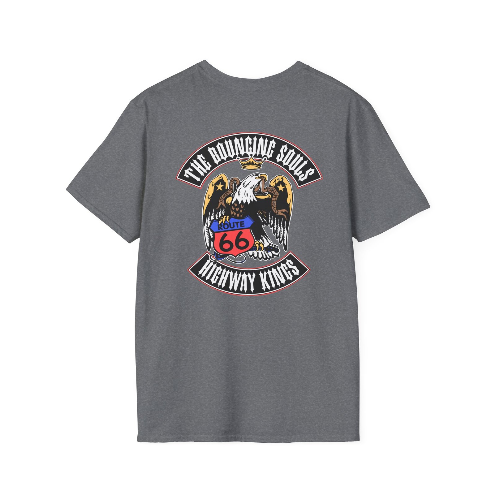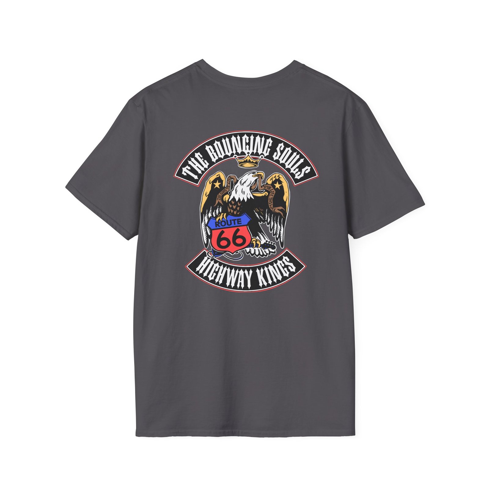 The The Bouncing Souls Highway Kings unisex soft-style t-shirt puts a new spin on casual comfort. Made from very soft materials, this tee is 100% cotton for solid colors. Heather colors and sports grey include polyester. The shoulders have twill tape for improved durability. There are no side seams. The collar is made with ribbed knitting to prevent curling damage.